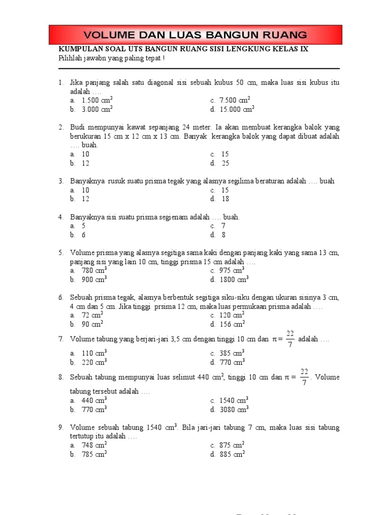 KUMPULAN SOAL UTS BANGUN RUANG SISI LENGKUNG KELAS IX Pilihlah jawabn yang paling tepat ! 1.