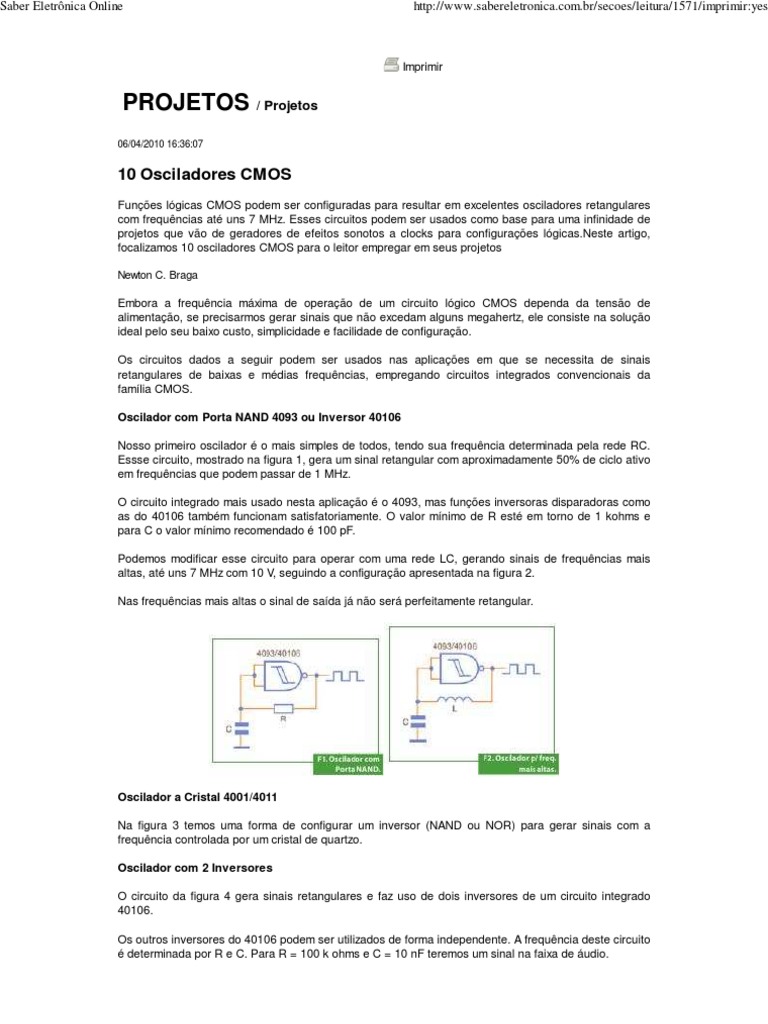 Embora a frequncia mxima de operao de um circuito lgico CMOS dependa da tenso de alimentao, se precisarmos gerar sinais que no excedam alguns megahertz, ele consiste na soluo ideal pelo seu baixo custo, simplicidade e facilidade de configurao. Os circuitos dados a seguir podem ser usados nas aplicaes em que se necessita de sinais retangulares de baixas e mdias frequncias, empregando circuitos integrados convencionais da famlia CMOS. Oscilador com Porta NAND 4093 ou Inversor 40106 Nosso primeiro oscilador o mais simples de todos, tendo sua frequncia determinada pela rede RC. Essse circuito, mostrado na figura 1, gera um sinal retangular com aproximadamente 50% de ciclo ativo em frequncias que podem passar de 1 MHz. O circuito integrado mais usado nesta aplicao o 4093, mas funes inversoras disparadoras como as do 40106 tambm funcionam satisfatoriamente. O valor mnimo de R est em torno de 1 kohms e para C o valor mnimo recomendado 100 pF. Podemos modificar esse circuito para operar com uma rede LC, gerando sinais de frequncias mais altas, at uns 7 MHz com 10 V, seguindo a configurao apresentada na figura 2. Nas frequncias mais altas o sinal de sada j no ser perfeitamente retangular.