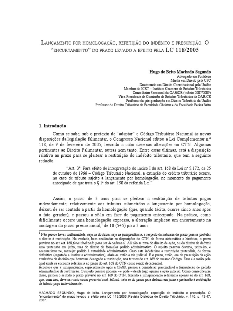 "encurtamento" do prazo levado a efeito pela LC 118/2005. Revista Dialética de Direito Tributário, v. 140, p. 43-47,