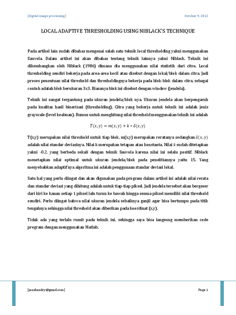 yakni -0.2, yang berbeda sekali dengan teknik Sauvola karena nilai ini selalu positif. Niblack menetapkan nilai optimal untuk ukuran jendela/blok pada penelitiannya yaitu 15. Yang menyebabkan adaptif nya algoritma ini adalah penggunaan standar deviasi lokal. Satu hal yang perlu diingat dan akan digunakan pada program dalam artikel ini adalah nilai rerata dan standar deviasi yang dihitung adalah untuk tiap-tiap piksel. Jadi jendela tersebut akan bergeser dari kiri ke kanan setiap 1 piksel lalu turun ke bawah hingga semua piksel memiliki nilai threshold sendiri. Perlu diingat bahwa nilai ukuran jendela sebaiknya ganjil agar bisa bertumpu pada titik tengahnya sehingga nilai threshold akan diberikan pada koordinat (x,y). Tidak ada yang terlalu rumit pada teknik ini, sehingga saya bisa langsung memberikan code program dengan menggunakan Matlab.