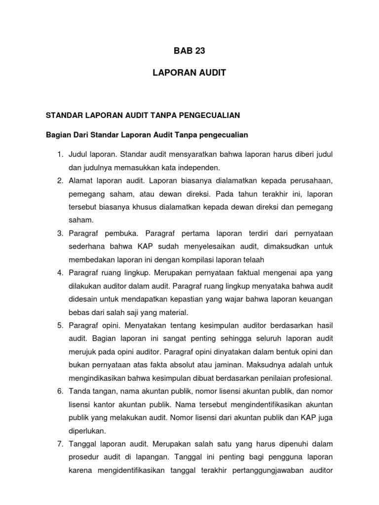 STANDAR LAPORAN AUDIT TANPA PENGECUALIAN Bagian Dari Standar Laporan Audit Tanpa pengecualian 1. Judul laporan. Standar audit mensyaratkan bahwa laporan harus diberi judul dan judulnya memasukkan kata independen. 2. Alamat laporan audit. Laporan biasanya dialamatkan kepada perusahaan, pemegang saham, atau dewan direksi. Pada tahun terakhir ini, laporan tersebut biasanya khusus dialamatkan kepada dewan direksi dan pemegang saham. 3. Paragraf pembuka. Paragraf pertama laporan terdiri dari pernyataan sederhana bahwa KAP sudah menyelesaikan audit, dimaksudkan untuk membedakan laporan ini dengan kompilasi laporan telaah 4. Paragraf ruang lingkup. Merupakan pernyataan faktual mengenai apa yang dilakukan auditor dalam audit. Paragraf ruang lingkup menyataka bahwa audit didesain untuk mendapatkan kepastian yang wajar bahwa laporan keuangan bebas dari salah saji yang material. 5. Paragraf opini. Menyatakan tentang kesimpulan auditor berdasarkan hasil audit. Bagian laporan ini sangat penting sehingga seluruh laporan audit merujuk pada opini auditor. Paragraf opini dinyatakan dalam bentuk opini dan bukan pernyataan atas fakta absolut atau jaminan. Maksudnya adalah untuk mengindikasikan bahwa kesimpulan dibuat berdasarkan penilaian profesional. 6. Tanda tangan, nama akuntan publik, nomor lisensi akuntan publik, dan nomor lisensi kantor akuntan publik. Nama tersebut mengindentifikasikan akuntan publik yang melakukan audit. Nomor lisensi dari akuntan publik dan KAP juga diperlukan. 7. Tanggal laporan audit. Merupakan salah satu yang harus dipenuhi dalam prosedur audit di lapangan. Tanggal ini penting bagi pengguna laporan karena mengidentifikasikan tanggal terakhir pertanggungjawaban auditor