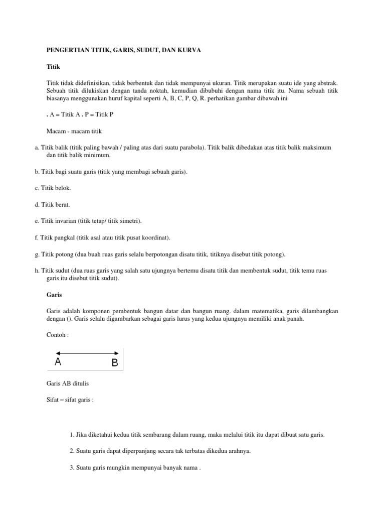 ukuran. Titik merupakan suatu ide yang abstrak. Sebuah titik dilukiskan dengan tanda noktah, kemudian dibubuhi dengan nama titik itu. Nama sebuah titik biasanya menggunakan huruf kapital seperti A, B, C, P, Q, R. perhatikan gambar dibawah ini . A = Titik A . P = Titik P Macam - macam titik a. Titik balik (titik paling bawah / paling atas dari suatu parabola). Titik balik dibedakan atas titik balik maksimum dan titik balik minimum. b. Titik bagi suatu garis (titik yang membagi sebuah garis). c. Titik belok. d. Titik berat. e. Titik invarian (titik tetap/ titik simetri). f. Titik pangkal (titik asal atau titik pusat koordinat). g. Titik potong (dua buah ruas garis selalu berpotongan disatu titik, titiknya disebut titik potong). h. Titik sudut (dua ruas garis yang salah satu ujungnya bertemu disatu titik dan membentuk sudut, titik temu ruas garis itu disebut titik sudut). Garis Garis adalah komponen pembentuk bangun datar dan bangun ruang. dalam matematika, garis dilambangkan dengan (). Garis selalu digambarkan sebagai garis lurus yang kedua ujungnya memiliki anak panah. Contoh :
