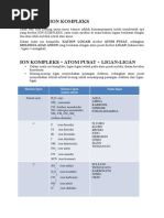 Struktur Ion Kompleks Ion kompleks adalah ion yang terbentuk dari dari satu kation tunggal (biasanyaion logam transisi) yang terikat langsung pada beberapa anion atau molekul netral. Ion kompleks terdiri dari ion atau atom pusat atau ligan-ligan. Ion kompleks Fe (CN)64- terdiri dari ion pusat Fe2+ dan 6 ligan CN-, sedangkan ion kompleks Cu(NH3)42+ terdiri dari ion pusat Cu2+ dan 4 ligan NH3. Ligan-liga terikat pada ion pusat melalui ikatan kovalen koordinat. B. Ligan Menurut teori ikatan valensi, ikatan antara ikatan pusat dengan liganya ialah ikatan kovalen koordinat dengan ligan sebagai penyumbang pasangan elektron, sedangkan ion pusat menyiapkan ion kosong. Ligan mempunyai pasangan bebas. Ligan yang mempuinyai satu pasang elektron disebut ligan unidentan, yang mempunyai dua pasang elektron disebut bidentan, dan yang lebih polidentan. C. Bilangan Koordinasi jumlah ligan sederhana atau jumlah ikatan koordinasi yang dibentuk oleh satu ion pusat yaitu bilangan koordinasi ion pusat. Biasanya, bilangan koordinasi suatu ion pusat sama dengan 2 kali bilangan oksidasinya. D. Muatan Ion Kompleks Muatan ion kompleks sama dengan jumlah muatan ion pusat dengan liganliganya.