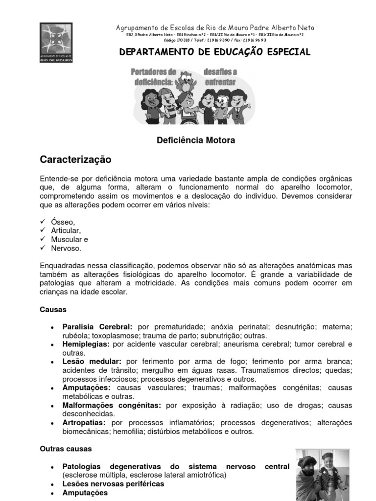 Entende-se por deficincia motora uma variedade bastante ampla de condies orgnicas que, de alguma forma, alteram o funcionamento normal do aparelho locomotor, comprometendo assim os movimentos e a deslocao do indivduo. Devemos considerar que as alteraes podem ocorrer em vrios nveis: sseo, Articular, Muscular e Nervoso. Enquadradas nessa classificao, podemos observar no s as alteraes anatmicas mas tambm as alteraes fisiolgicas do aparelho locomotor. grande a variabilidade de patologias que alteram a motricidade. As condies mais comuns podem ocorrer em crianas na idade escolar. Causas