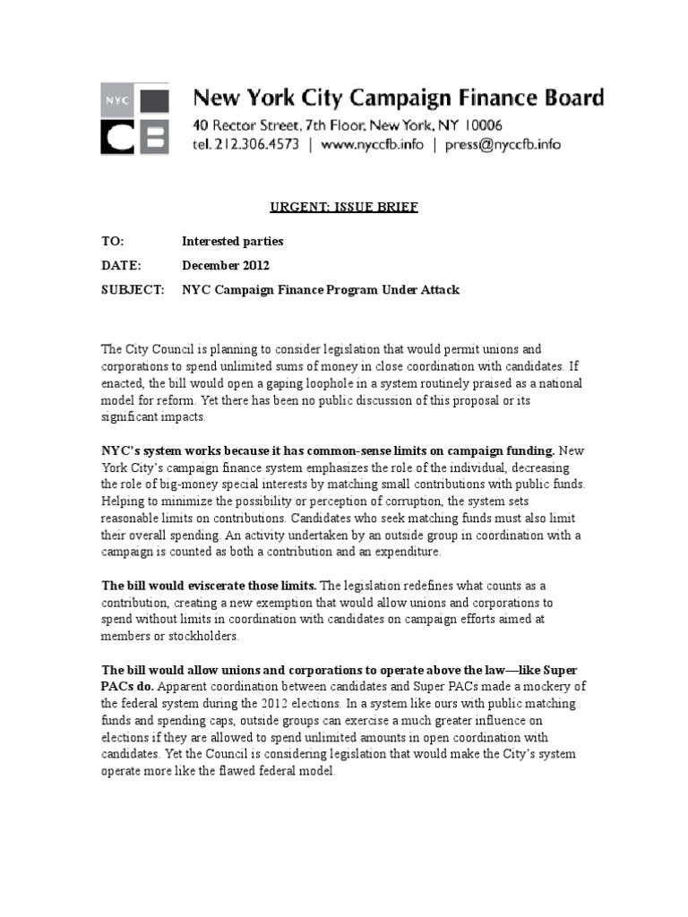 The City Council is planning to consider legislation that would permit unions and corporations to spend unlimited sums of money in close coordination with candidates. If enacted, the bill would open a gaping loophole in a system routinely praised as a national model for reform. Yet there has been no public discussion of this proposal or its significant impacts. NYCs system works because it has common-sense limits on campaign funding. New York Citys campaign finance system emphasizes the role of the individual, decreasing the role of big-money special interests by matching small contributions with public funds. Helping to minimize the possibility or perception of corruption, the system sets reasonable limits on contributions. Candidates who seek matching funds must also limit their overall spending. An activity undertaken by an outside group in coordination with a campaign is counted as both a contribution and an expenditure. The bill would eviscerate those limits. The legislation redefines what counts as a contribution, creating a new exemption that would allow unions and corporations to spend without limits in coordination with candidates on campaign efforts aimed at members or stockholders. The bill would allow unions and corporations to operate above the lawlike Super PACs do. Apparent coordination between candidates and Super PACs made a mockery of the federal system during the 2012 elections. In a system like ours with public matching funds and spending caps, outside groups can exercise a much greater influence on elections if they are allowed to spend unlimited amounts in open coordination with candidates. Yet the Council is considering legislation that would make the Citys system operate more like the flawed federal model.