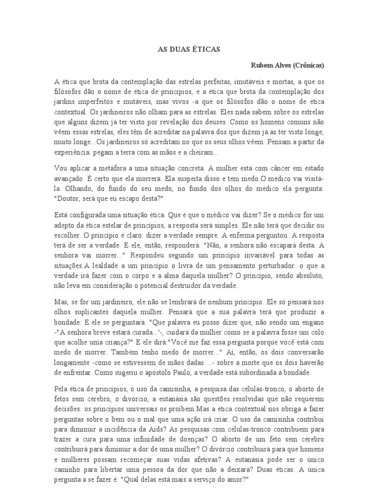 A tica que brota da contemplao das estrelas perfeitas, imutveis e mortas, a que os filsofos do o nome de tica de princpios, e a tica que brota da contemplao dos jardins imperfeitos e mutveis, mas vivos -a que os filsofos do o nome de tica contextual. Os jardineiros no olham para as estrelas. Eles nada sabem sobre os estrelas que alguns dizem j ter visto por revelao dos deuses. Como os homens comuns no vem essas estrelas, eles tm de acreditar na palavra dos que dizem j as ter visto longe, muito longe...Os jardineiros s acreditam no que os seus olhos vem. Pensam a partir da experincia: pegam a terra com as mos e a cheiram... Vou aplicar a metfora a uma situao concreta. A mulher est com cncer em estado avanado. certo que ela morrer. Ela suspeita disso e tem medo.O mdico vai visitla. Olhando, do fundo do seu medo, no fundo dos olhos do mdico ela pergunta: "Doutor, ser que eu escapo desta?" Est configurada uma situao tica. Que que o mdico vai dizer? Se o mdico for um adepto da tica estelar de princpios, a resposta ser simples. Ele no ter que decidir ou escolher. O princpio claro: dizer a verdade sempre. A enferma perguntou. A resposta ter de ser a verdade. E ele, ento, responder: "No, a senhora no escapar desta. A senhora vai morrer..." Respondeu segundo um princpio invarivel para todas as situaes.A lealdade a um princpio o livra de um pensamento perturbador: o que a verdade ir fazer com o corpo e a alma daquela mulher? O princpio, sendo absoluto, no leva em considerao o potencial destruidor da verdade. Mas, se for um jardineiro, ele no se lembrar de nenhum princpio. Ele s pensar nos olhos suplicantes daquela mulher. Pensar que a sua palavra ter que produzir a bondade. E ele se perguntar: "Que palavra eu posso dizer que, no sendo um engano -"A senhora breve estar curada...'-, cuidar da mulher como se a palavra fosse um colo que acolhe uma criana?" E ele dir:"Voc me faz essa pergunta porque voc est com medo de morrer. Tambm tenho medo de morrer..." A, ento, os dois conversaro longamente -como se estivessem de mos dadas ...- sobre a morte que os dois havero de enfrentar. Como sugeriu o apstolo Paulo, a verdade est subordinada bondade. Pela tica de princpios, o uso da camisinha, a pesquisa das clulas-tronco, o aborto de fetos sem crebro, o divrcio, a eutansia so questes resolvidas que no requerem decises: os princpios universais os probem.Mas a tica contextual nos obriga a fazer perguntas sobre o bem ou o mal que uma ao ir criar. O uso da camisinha contribui para diminuir a incidncia da Aids? As pesquisas com clulas-tronco contribuem para trazer a cura para uma infinidade de doenas? O aborto de um feto sem crebro contribuir para diminuir a dor de uma mulher? O divrcio contribuir para que homens e mulheres possam recomear suas vidas afetivas? A eutansia pode ser o nico caminho para libertar uma pessoa da dor que no a deixar? Duas ticas. A nica pergunta a se fazer : "Qual delas est mais a servio do amor?"