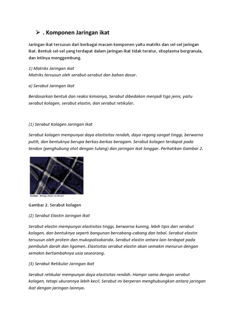 (1) Serabut Kolagen Jaringan Ikat Serabut kolagen mempunyai daya elastisitas rendah, daya regang sangat tinggi, berwarna putih, dan bentuknya berupa berkas-berkas beragam. Serabut kolagen terdapat pada tendon (penghubung otot dengan tulang) dan jaringan ikat longgar. Perhatikan Gambar 2.
