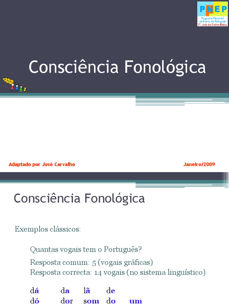 Exemplos clssicos: Quantas vogais tem o Portugus? Resposta comum: 5 (vogais grficas) Resposta correcta: 14 vogais (no sistema lingustico) d d s da dor l l de som do um ri sente fim