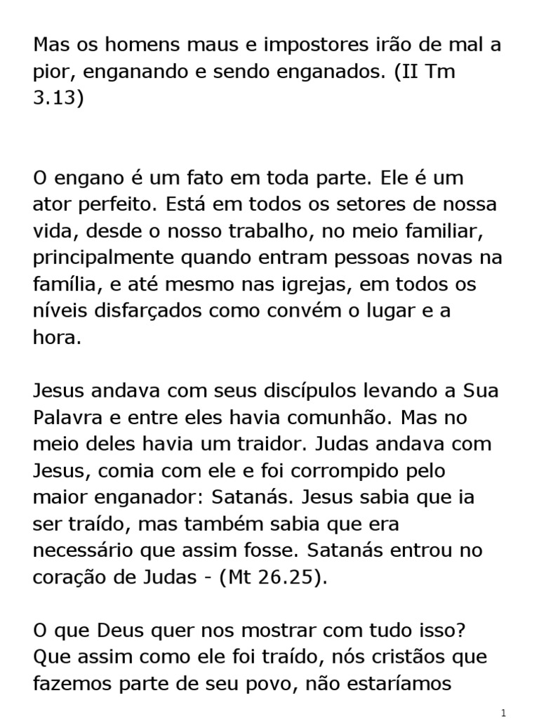 O engano um fato em toda parte. Ele um ator perfeito. Est em todos os setores de nossa vida, desde o nosso trabalho, no meio familiar, principalmente quando entram pessoas novas na famlia, e at mesmo nas igrejas, em todos os nveis disfarados como convm o lugar e a hora. Jesus andava com seus discpulos levando a Sua Palavra e entre eles havia comunho. Mas no meio deles havia um traidor. Judas andava com Jesus, comia com ele e foi corrompido pelo maior enganador: Satans. Jesus sabia que ia ser trado, mas tambm sabia que era necessrio que assim fosse. Satans entrou no corao de Judas - (Mt 26.25). O que Deus quer nos mostrar com tudo isso? Que assim como ele foi trado, ns cristos que fazemos parte de seu povo, no estaramos