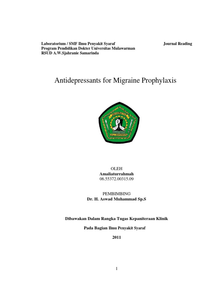 ANTIDEPRESAN Sebagai mekanisme yang mendasari migrain masih belum sepenuhnya dipahami, berbagai jenis obat telah digunakan untuk profilaksis migrain sejauh ini. Penelitian baru pada patofisiologi migren telah dibawa ke depan konsep-konsep baru untuk pencegahan migrain. Mekanisme aksi untuk pengurangan nyeri migrain dianggap dengan inhibisi reuptake serotonin dan norepinefrin dalam cornu dorsalis, namun, mekanisme lain yang mungkin adalah dengan blokade alfa-adrenergik, efek kanal natrium dan N- metil-D-aspartat asam (NMDA) reseptor antagonisme. Oleh karena itu, obat yang terlibat harus berkumpul terutama pada dua sasaran: penghambatan eksitasi kortikal dan pemulihan dysmodulation nociceptive.