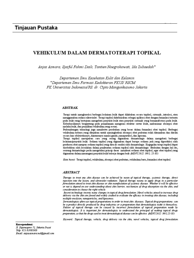 Therapy to treat any skin disease can be achieved by mean of topical therapy, systemic therapy, direct injection into the lesion, and ultraviolet radiation. Topical therapy means to apply drugs in a particular formulation aimed to treat skin disease or skin manifestation of systemic disease. Whether it will be effective or not is depend on our understanding about skin barrier, mechanism of drug absorption via the skin, and consideration to choose the right vehicle. Recent technology invents many changes in topical drug formulation. Novel vehicles aimed to increase drug delivery via the skin are found and widely studied to evaluate the efficacy in treating skin disease, including multiple emulsion, nanoparticles, and liposomes. Dermatologists often use topical preparations in order to treat skin diseases. Topical drug preparations can be a product directly produced by drug industries or a preparation that dermatologists make it themselves. Failure of topical therapy can be caused by incorrect formulation of topical preparation made by dermatologists. It is important for dermatologists to understand the principal of making topical drugs preparation, so that the drugs used to treat dermatological disease can be effective. (MDVI 2012: 39/1;25-35) Keyword: Topical therapy, vehicle, drug delivery via the skin, novel vehicles, topical drug formulation Korespondensi : Jl. Diponegoro 71, Jakarta Pusat Telp. 021-31935383 Email: anjasasmara.md@gmail.com
