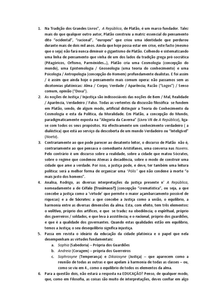 . Talez mais do que qualquer outro autor, Plato construiu a matriz essencial do pensamento dito ocidental, racional, europeu que criou uma identidade que perdurou durante mais de dois mil anos. Ainda que hoje possa estar em crise, este facto (mesmo que o seja) no far nunca diminuir o gigantismo de Plato. Colhendo e sistematizando uma linha de pensamento que vinha de um dos lados da tradio grega pr-socrtica (Pitagricos, Orfismo, Parmnides), Plato cria uma Cosmologia (concepo do mundo), uma Epistemologia / Gnoseologia (uma teoria do conhecimento) e uma Psicologia / Antropologia (concepo do Homem) profundamente dualistas. E foi assim / assim que ainda hoje o pensamento mais comum opera: no passamos sem as dicotomias platnicas: Alma / Corpo; Verdade / Aparncia; Razo (Logos) / Senso comum, opinio (Doxa). 2. As noes de Justia / Injustia so indissociveis das noes de Bem / Mal, Realidade / Aparncia, Verdadeiro / Falso. Todas as vertentes da discusso filosfica se fundem em Plato, sendo, de algum modo, artificial distinguir a Teoria do Conhecimento da Cosmologia e esta da Poltica, da Moralidade. Em Plato, a concepo do Mundo, paradigmaticamente exposta na Alegoria da Caverna (Livro VII de A Repblica), ligase com todos os seus propsitos. H efectivamente um conhecimento verdadeiro ( a dialctica) que est ao servio da descoberta de um mundo Verdadeiro ou Inteligvel (Noeta). 3. Contrariamente ao que pode parecer ao desatento leitor, o discurso de Plato no , contrariamente ao que pensava o comediante Aristfanes, uma conversa nas Nuvens. Pelo contrrio um discurso sobre a realidade, sobre a cidade que matou Scrates, sobre o regime que condenou Atenas decadncia, sobre o modo de construir uma cidade que ame a verdade. Por isso, a justia pode, e deve, ter tambm uma leitura poltica: ser a melhor forma de organizar uma Plis que no condene morte o mais justo dos homens. 4. Analisa, Rodrigo, as diversas interpretaes da justia presente n A Repblica, nomeadamente a de Cfalo (Trasmaco?) (concepo crematstica, ou seja, a que concebe a justia como a virtude que permite o maior aambarcamento possvel de riquezas) e a de Scrates: a que concebe a Justia como a unio, o equilbrio, a harmonia entre as diversas dimenses da alma. Esta, com efeito, tem trs elementos: o volitivo, prprio dos artfices, e que se traduz na obedincia; o espiritual, prprio dos guerreiros / soldados, e que leva assistncia; e o racional, prprio dos guardies, e que a qualidade dos governantes. Quando estas qualidades esto em equilbrio, temos a Justia; o seu desequilbrio significa injustia. 5. Passa em revista o iderio da educao da cidade platnica e o papel que nela desempenham as virtudes fundamentais: a. Sophia (Sabedoria) Prpria dos Guardies b. Andreia (Coragem) prpria dos Guerreiros c. Sophrosyne (Temperana) e Dikaiosyne (Justia) que aparecem como a reunio de todas as outras e que apelam harmonia de todas as classes ou, como se viu em 4., como o equilbrio de todos os elementos da alma. 6. Para a questo dois, no estar a resposta na EDUCAO? Penso, de qualquer modo, que, como em Filosofia, as coisas so muito de interpretaes, deves confiar em algo