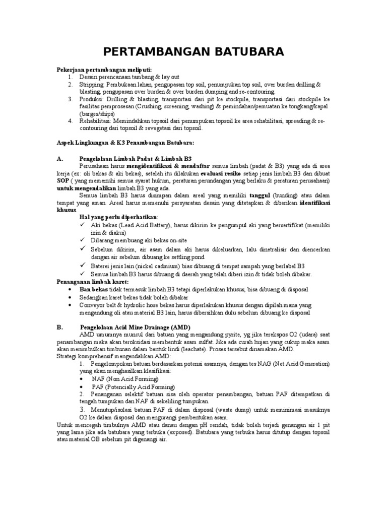 Pekerjaan pertambangan meliputi: 1. Desain perencanaan tambang & lay out 2. Stripping: Pembukaan lahan, pengupasan top soil, penumpukan top soil, over burden drilling & blasting, pengupasan over burden & over burden dumping and re-contouring. 3. Produksi: Drilling & blasting, transportasi dari pit ke stockpile, transportasi dari stockpile ke fasilitas pemprosesan (Crushing, screening, washing) & pemindahan/pemuatan ke tongkang/kapal (barges/ships) 4. Rehabilitasi: Memindahkan topsoil dari penumpukan topsoil ke area rehabilitasi, spreading & recontouring dari topsoil & revegetasi dari topsoil. Aspek Lingkungan & K3 Penambangan Batubara: A. Pengelolaan Limbah Padat & Limbah B3 Perusahaan harus mengidentifikasi & mendaftar semua limbah (padat & B3) yang ada di area kerja (ex: oli bekas & aki bekas), setelah itu dilakukan evaluasi resiko setiap jenis limbah B3 dan dibuat SOP ( yang memenuhi semua syarat hukum, peraturan perundangan yang berlaku & peraturan perusahaan) untuk mengendalikan limbah B3 yang ada. Semua limbah B3 harus disimpan dalam areal yang memiliki tanggul (bunding) atau dalam tempat yang aman. Areal harus memenuhi persyaratan desain yang ditetapkan & diberikan identifikasi khusus. Hal yang perlu diperhatikan: Aki bekas (Lead Acid Battery), harus dikirim ke pengumpul aki yang bersertifikat (memiliki izin & diakui) Dilarang membuang aki bekas on-site Sebelum dikirim, air asam dalam aki harus dikeluarkan, lalu dinetralisir dan diencerkan dengan air sebelum dibuang ke settling pond Baterei jenis lain (nickel cadmium) bias dibuang di tempat sampah yang berlabel B3 Semua limbah B3 harus dibuang di daerah yang telah diberi izin & tidak boleh dibakar. Penanganan limbah karet: Ban bekas tidak termasuk limbah B3 tetapi diperlakukan khusus, bisa dibuang di disposal Sedangkan karet bekas tidak boleh dibakar Conveyor belt & hydrolic hose bekas harus diperlakukan khusus dengan dipilah mana yang mengandung oli atau material B3 lain, harus dibersihkan dulu sebelum dibuang ke disposal B. Pengelolaan Acid Mine Drainage (AMD) AMD umumnya muncul dari batuan yang mengandung pyrite, yg jika terekspos O2 (udara) saat penambangan maka akan teroksidasi membentuk asam sulfat. Jika ada curah hujan yang cukup maka asam akan menimbulkan timbunan dalam bentuk lindi (leachate). Proses tersebut dinamakan AMD. Strategi komprehensif mengendalikan AMD: 1. Pengelompokan batuan berdasarkan potensi asamnya, dengan tes NAG (Net Acid Generation) yang akan menghasilkan klasifikasi: NAF (Non Acid Forming) PAF (Potencially Acid Forming) 2. Penanganan selektif batuan sisa oleh operator penambangan, batuan PAF ditempatkan di tengah tumpukan dan NAF di sekeliling tumpukan. 3. Menutup/isolasi batuan PAF di dalam disposal (waste dump) untuk meminimasi masuknya O2 ke dalam disposal dan mengurangi pembentukan asam. Untuk mencegah timbulnya AMD atau danau dengan pH rendah, tidak boleh terjadi genangan air 1 pit yang lama jika ada batubara yang terbuka (exposed). Batubara yang terbuka harus ditutup dengan topsoil atau material OB sebelum pit digenangi air.