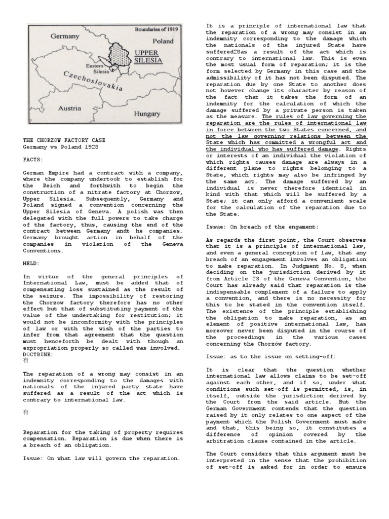 the company undertook to establish for the Reich and forthwith to begin the construction of a nitrate factory at Chorzow, Upper Silesia. Subsequently, Germany and Poland signed a convention concerning the Upper Silesia of Geneva. A polish was then delegated with the full powers to take charge of the factory, thus, causing the end of the contract between Germany andt he companies. Germany brought action in behalf of the companies in violation of the Geneva Conventions. HELD: In virtue of the general principles of International Law, must be added that of compensating loss sustained as the result of the seizure. The impossibility of restoring the Chorzow factory therefore has no other effect but that of substituting payment of the value of the undertaking for restitution; it would not be inconformity with the principles of law or with the wish of the parties to infer from that agreement that the question must henceforth be dealt with though an expropriation properly so called was involved. DOCTRINE: The reparation of a wrong may consist in an indemnity corresponding to the damages with nationals of the injured party state have suffered as a result of the act which is contrary to international law. Reparation for the taking of property requires compensation. Reparation is due when there is a breach of an obligation. Issue: On what law will govern the reparation.