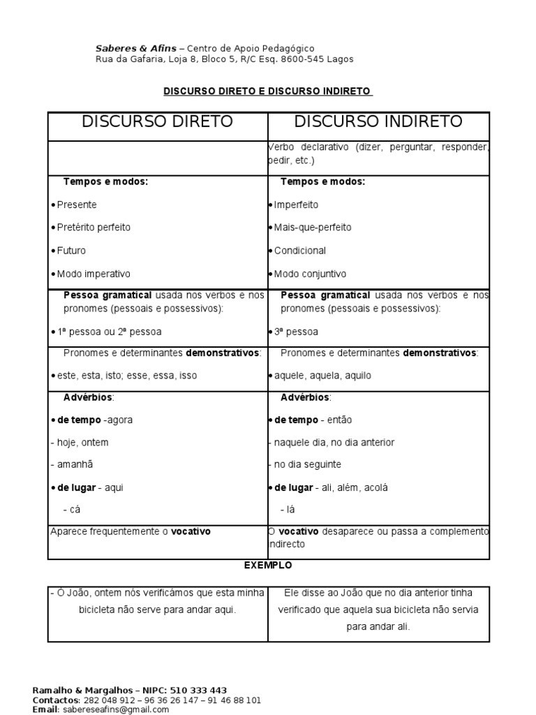 Tempos e modos: Imperfeito Mais-que-perfeito Condicional Modo conjuntivo Pessoa gramatical usada nos verbos e nos pronomes (pessoais e possessivos): 3 pessoa Pronomes e determinantes demonstrativos: aquele, aquela, aquilo Advrbios: de tempo - ento - naquele dia, no dia anterior - no dia seguinte de lugar - ali, alm, acol - l O vocativo desaparece ou passa a complemento indirecto EXEMPLO