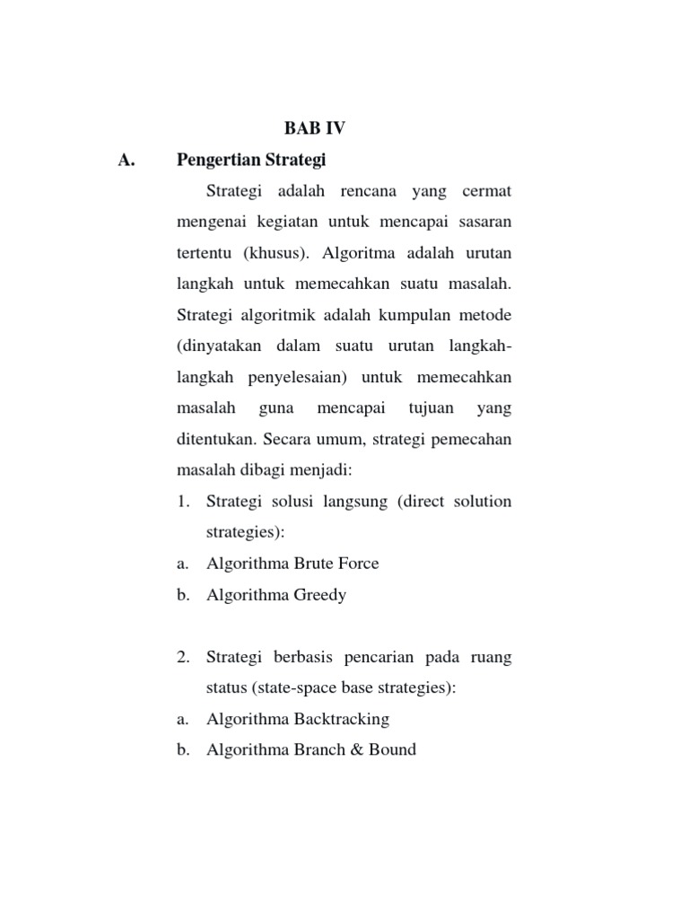 2. Strategi berbasis pencarian pada ruang status (state-space base strategies): a. Algorithma Backtracking b. Algorithma Branch & Bound