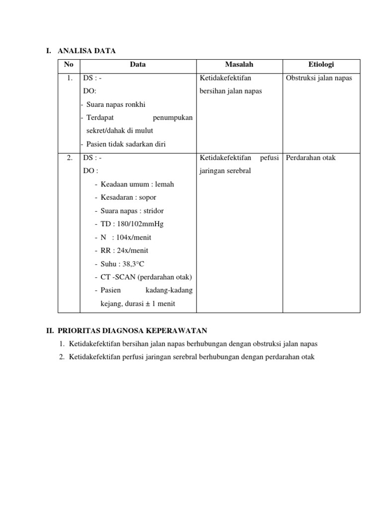 II. PRIORITAS DIAGNOSA KEPERAWATAN 1. Ketidakefektifan bersihan jalan napas berhubungan dengan obstruksi jalan napas 2. Ketidakefektifan perfusi jaringan serebral berhubungan dengan perdarahan otak