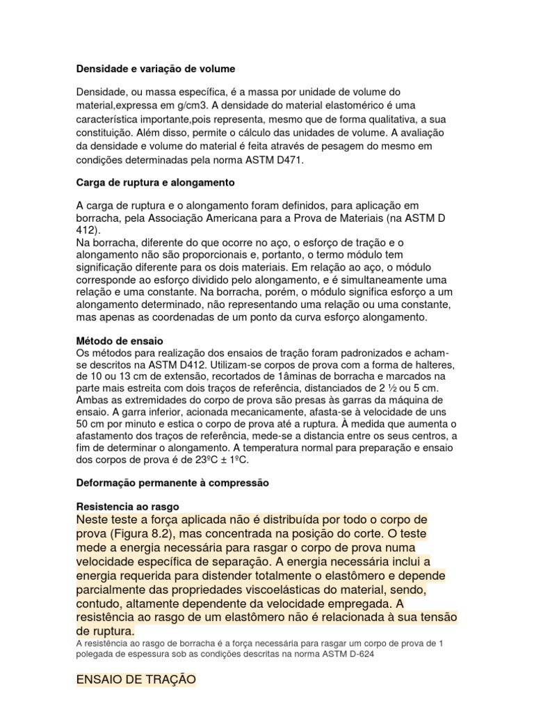 . A densidade do material elastomrico uma caracterstica importante,pois representa, mesmo que de forma qualitativa, a sua constituio. Alm disso, permite o clculo das unidades de volume. A avaliao da densidade e volume do material feita atravs de pesagem do mesmo em condies determinadas pela norma ASTM D471. Carga de ruptura e alongamento
