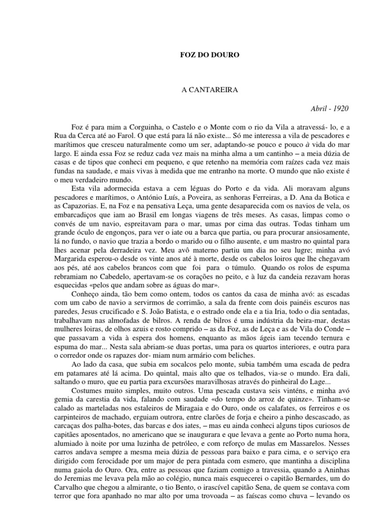 A CANTAREIRA Abril - 1920 Foz para mim a Corguinha, o Castelo e o Monte com o rio da Vila a atravess- lo, e a Rua da Cerca at ao Farol. O que est para l no existe... S me interessa a vila de pescadores e martimos que cresceu naturalmente como um ser, adaptando-se pouco e pouco vida do mar largo. E ainda essa Foz se reduz cada vez mais na minha alma a um cantinho a meia dzia de casas e de tipos que conheci em pequeno, e que retenho na memria com razes cada vez mais fundas na saudade, e mais vivas medida que me entranho na morte. O mundo que no existe o meu verdadeiro mundo. Esta vila adormecida estava a cem lguas do Porto e da vida. Ali moravam alguns pescadores e martimos, o Antnio Lus, a Poveira, as senhoras Ferreiras, a D. Ana da Botica e as Capazorias. E, na Foz e na pensativa Lea, uma gente desaparecida com os navios de vela, os embarcadios que iam ao Brasil em longas viagens de trs meses. As casas, limpas como o convs de um navio, espreitavam para o mar, umas por cima das outras. Todas tinham um grande culo de engonos, para ver o iate ou a barca que partia, ou para procurar ansiosamente, l no fundo, o navio que trazia a bordo o marido ou o filho ausente, e um mastro no quintal para lhes acenar pela derradeira vez. Meu av materno partiu um dia no seu lugre; minha av Margarida esperou-o desde os vinte anos at morte, desde os cabelos loiros que lhe chegavam aos ps, at aos cabelos brancos com que foi para o tmulo. Quando os rolos de espuma rebramiam no Cabedelo, apertavam-se os coraes no peito, e luz da candeia rezavam horas esquecidas pelos que andam sobre as guas do mar. Conheo ainda, to bem como ontem, todos os cantos da casa de minha av: as escadas com um cabo de navio a servirmos de corrimo, a sala da frente com dois painis escuros nas paredes, Jesus crucificado e S. Joo Batista, e o estrado onde ela e a tia Iria, todo o dia sentadas, trabalhavam nas almofadas de bilros. A renda de bilros uma indstria da beira-mar, destas mulheres loiras, de olhos azuis e rosto comprido as da Foz, as de Lea e as de Vila do Conde que passavam a vida espera dos homens, enquanto as mos geis iam tecendo ternura e espuma do mar... Nesta sala abriam-se duas portas, uma para os quartos interiores, e outra para o corredor onde os rapazes dor- miam num armrio com beliches. Ao lado da casa, que subia em socalcos pelo monte, subia tambm uma escada de pedra em patamares at l acima. Do quintal, mais alto que os telhados, via-se o mundo. Era dali, saltando o muro, que eu partia para excurses maravilhosas atravs do pinheiral do Lage... Costumes muito simples, muito outros. Uma pescada custava seis vintns, e minha av gemia da carestia da vida, falando com saudade do tempo do arroz de quinze. Tinham-se calado as marteladas nos estaleiros de Miragaia e do Ouro, onde os calafates, os ferreiros e os carpinteiros de machado, erguiam outrora, entre clares de forja e cheiro a pinho descascado, as carcaas dos palha-botes, das barcas e dos iates, mas eu ainda conheci alguns tipos curiosos de capites aposentados, no americano que se inaugurara e que levava a gente ao Porto numa hora, alumiado noite por uma luzinha de petrleo, e com reforo de mulas em Massarelos. Nesses carros andava sempre a mesma meia dzia de pessoas para baixo e para cima, e o servio era dirigido com ferocidade por um major de pera pintada com esmero, que mantinha a disciplina numa gaiola do Ouro. Ora, entre as pessoas que faziam comigo a travessia, quando a Aninhas do Jeremias me levava pela mo ao colgio, nunca mais esquecerei o capito Bernardes, um do Carvalho que chegou a almirante, o tio Bento, o irascvel capito Sena, de quem se contava com terror que fora apanhado no mar alto por uma trovoada as fascas como chuva levando os