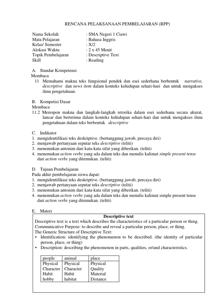 Konfirmasi (10): Siswa dan guru membahas jawaban secara bersama-sama (jujur) Guru memberikan feedback kepada siswa. (tanggung jawab) c. Kegiatan Akhir (5 menit) Siswa merangkum materi yang sudah dipelajari hari itu. (tanggung jawab) Melakukan refleksi terhadap jalannya proses pembelajaran pada hari itu. (tanggung jawab) I. Sumber/bahan/alat Aik, Kam Chuan and Hui, Kam Kai.1992. Longman Dictionary of Grammar and Usage. Singapore: PT Prenhallindo. Astuti, Eka Mulya. 2010. English Zone for Senior High School Students Year X. Jakarta: Erlangga. http://www.prof2000.pt/users/getsmart/ccdi/tp29/plans.htm http://www.superteacherworksheets.com http://diyahlaily.wordpress.com/2012/11/16/report-vs-descriptive-text/ https://www.google.com/url?sa=t&rct=j&q=&esrc=s&source=web&cd=12&cad=rja& http://www.buzzle.com/articles/list-of-descriptive-adjectives.html http://www.wordsmile.com/action-verb-stative Laptop Infokus Penilaian A. Pedoman Penilaian: Indikator 1. Mengidentifikasi generic structure 2. menjawab pertanyaan seputar text