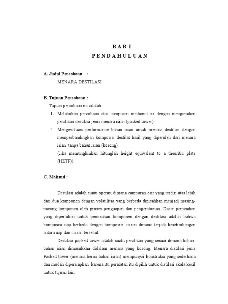MENARA DESTILASI B. Tujuan Percobaan : Tujuan percobaan ini adalah : 1. Melakukan percobaan atas campuran methanol-air dengan mengunakan peralatan destilasi jenis menara isian (packed tower) 2. Mengevaluasi performance bahan isian untuk menara destilasi dengan memperbandingkan komposisi destilat hasil yang diperoleh dari menara isian tanpa bahan isian (kosong). (Jika memungkinkan hitunglah height equivalent to a theoritic plate (HETP)). C. Maksud : Destilasi adalah suatu operasi dimana campuran cair yang terdiri atas lebih dari dua komponen dengan volatilitas yang berbeda dipisahkan menjadi masingmasing komponen oleh proses penguapan dan pengembunan. Dasar pemisahan yang diperlukan untuk pemisahan komponen dengan destilasi adalah bahwa komposisi uap berbeda dengan komposisi cairan dimana terjadi kesetimbangan antara uap dan cairan tersebut. Destilasi packed tower adalah suatu peralatan yang sesuai dimana bahanbahan isian dimasukkan didalam menara yang kosong. Menara distilasi jenis Packed tower (menara berisi bahan isian) mempunyai konstruksi yang sederhana dan mudah dipersiapkan, karena itu peralatan itu dipilih untuk distilasi skala kecil untuk tujuan lain.