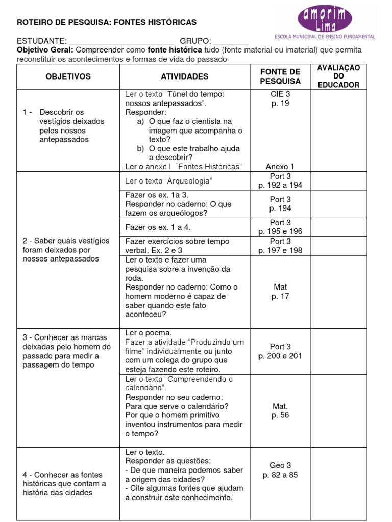 (fonte material ou imaterial) que permita reconstituir os acontecimentos e formas de vida do passado OBJETIVOS ATIVIDADES Ler o texto Tnel do tempo: nossos antepassados. Responder: a) O que faz o cientista na imagem que acompanha o texto? b) O que este trabalho ajuda a descobrir? Ler o anexo I Fontes Histricas Ler o texto Arqueologia Fazer os ex. 1a 3. Responder no caderno: O que fazem os arquelogos? Fazer os ex. 1 a 4. 2 - Saber quais vestgios foram deixados por nossos antepassados Fazer exerccios sobre tempo verbal. Ex. 2 e 3 Ler o texto e fazer uma pesquisa sobre a inveno da roda. Responder no caderno: Como o homem moderno capaz de saber quando este fato aconteceu? Ler o poema. Fazer a atividade Produzindo um filme individualmente ou junto com um colega do grupo que esteja fazendo este roteiro. Ler o texto Compreendendo o calendrio. Responder no seu caderno: Para que serve o calendrio? Por que o homem primitivo inventou instrumentos para medir o tempo? Ler o texto. Responder as questes: - De que maneira podemos saber a origem das cidades? - Cite algumas fontes que ajudam a construir este conhecimento. FONTE DE PESQUISA CIE 3 p. 19