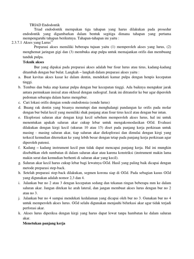 dalam bentuk segitiga dimana tahapan yang pertama mempengaruhi tahapan berikutnya. Tahapan-tahapan ini yaitu : 2.3.7.1 Akses yang Lurus11 Preparasi akses memiliki beberapa tujuan yaitu (1) memperoleh akses yang lurus, (2) menghemat jaringan gigi dan (3) membuka atap pulpa untuk memajankan orifis dan membuang tanduk pulpa. Teknik akses Bur yang dipakai pada preparasi akses adalah bur fisur lurus atau tirus, kadang-kadang ditambah dengan bur bulat. Langkah langkah dalam preparasi akses yaitu : a. Buat kavitas akses kasar ke dalam dentin, mendekati kamar pulpa dengan henpis kecepatan tinggi. b. Tembus dan buka atap kamar pulpa dengan bur kecepatan tinggi. Ada baiknya mengukur jarak antara permukaan insisal atau oklusal dengan radiograf. Jarak ini ditransfer ke bur agar diperoleh pedoman sebarapa dalam harus mengebur. c. Cari lokasi orifis dengan sonde endodonsia (sonde lurus) d. Buang rak dentin yang bisanya menutupi dan menghalangi pandangan ke orifis pada molar dengan bur bulat kecil yang memiliki shak panjang atau fisur tirus kecil atau dengan bur intan. e. Eksplorasi saluran akar dengan kirgi kecil sebelum memperoleh akses lurus, hal ini untuk menentukan apakah saluran akar cukup lebar untuk mengakomodasikan GGd. Evaluasi dilakukan dengan kirgi kecil (ukuran 10 atau 15) diset pada panjang kerja perkiraan untuk masing - masing saluran akar, tiap saluran akar dieksplorasi dan dimulai dengan kirgi yang terkecil kemudian diteruskan ke yang lebih besar dengan tetap pada panjang kerja perkiraan agar diperoleh patensi. f. Kadang kadang instrument kecil pun tidak dapat mencapai panjang kerja. Hal ini mungkin disebabkan oleh sumbatan di dalam saluran akar atau karena konstriksi (instrument makin lama makin serat dan kemudian berhenti di saluran akar yang kecil). g. Saluran akar kecil harus cukup lebar bagi lewatnya GGd. Hasil yang paling baik dicapai dengan metode preparasi step-back. h. Setelah preparasi step-back dilakukan, segmen korona siap di GGd. Pada sebagian kasus GGd yang digunakan adalah nomor 2,3 dan 4. i. Jalankan bur no 2 atau 3 dengan kecepatan sedang dan tekanan ringan beberapa mm ke dalam saluran akar. Jangan ditekan ke arah lateral, dan jangan membuat akses lurus dengan bur no 2 atau no 3. j. Jalankan bur no 4 sampai mendekati kedalaman yang dicapai oleh bur no 3. Gunakan bur no 4 untuk memperoleh akses lurus. GGd selalu digunakan menjauhi bifurkasi akar agar tidak terjadi perforasi akar. k. Akses lurus diperiksa dengan kirgi yang harus dapat lewat tanpa hambatan ke dalam saluran akar. Menetukan panjang kerja