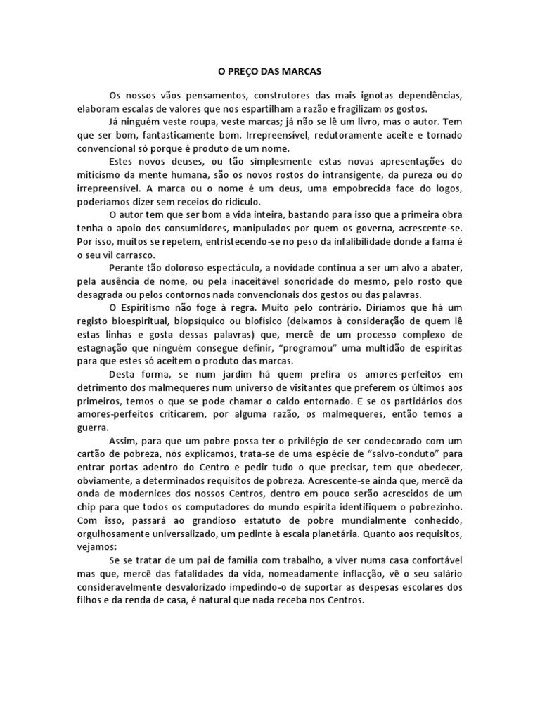 nos espartilham a razo e fragilizam os gostos. J ningum veste roupa, veste marcas; j no se l um livro, mas o autor. Tem que ser bom, fantasticamente bom. Irrepreensvel, redutoramente aceite e tornado convencional s porque produto de um nome. Estes novos deuses, ou to simplesmente estas novas apresentaes do miticismo da mente humana, so os novos rostos do intransigente, da pureza ou do irrepreensvel. A marca ou o nome um deus, uma empobrecida face do logos, poderamos dizer sem receios do ridculo. O autor tem que ser bom a vida inteira, bastando para isso que a primeira obra tenha o apoio dos consumidores, manipulados por quem os governa, acrescente-se. Por isso, muitos se repetem, entristecendo-se no peso da infalibilidade donde a fama o seu vil carrasco. Perante to doloroso espectculo, a novidade continua a ser um alvo a abater, pela ausncia de nome, ou pela inaceitvel sonoridade do mesmo, pelo rosto que desagrada ou pelos contornos nada convencionais dos gestos ou das palavras. O Espiritismo no foge regra. Muito pelo contrrio. Diramos que h um registo bioespiritual, biopsquico ou biofsico (deixamos considerao de quem l estas linhas e gosta dessas palavras) que, merc de um processo complexo de estagnao que ningum consegue definir, programou uma multido de espritas para que estes s aceitem o produto das marcas. Desta forma, se num jardim h quem prefira os amores-perfeitos em detrimento dos malmequeres num universo de visitantes que preferem os ltimos aos primeiros, temos o que se pode chamar o caldo entornado. E se os partidrios dos amores-perfeitos criticarem, por alguma razo, os malmequeres, ento temos a guerra. Assim, para que um pobre possa ter o privilgio de ser condecorado com um carto de pobreza, ns explicamos, trata-se de uma espcie de salvo-conduto para entrar portas adentro do Centro e pedir tudo o que precisar, tem que obedecer, obviamente, a determinados requisitos de pobreza. Acrescente-se ainda que, merc da onda de modernices dos nossos Centros, dentro em pouco sero acrescidos de um chip para que todos os computadores do mundo esprita identifiquem o pobrezinho. Com isso, passar ao grandioso estatuto de pobre mundialmente conhecido, orgulhosamente universalizado, um pedinte escala planetria. Quanto aos requisitos, vejamos: Se se tratar de um pai de famlia com trabalho, a viver numa casa confortvel mas que, merc das fatalidades da vida, nomeadamente inflaco, v o seu salrio consideravelmente desvalorizado impedindo-o de suportar as despesas escolares dos filhos e da renda de casa, natural que nada receba nos Centros.