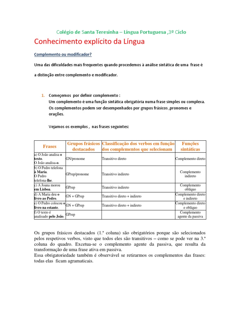 1. Comeemos por definir complemento : Um complemento uma funo sinttica obrigatria numa frase simples ou complexa. Os complementos podem ser desempenhados por grupos frsicos ,pronomes e oraes. Vejamos os exemplos , nas frases seguintes: