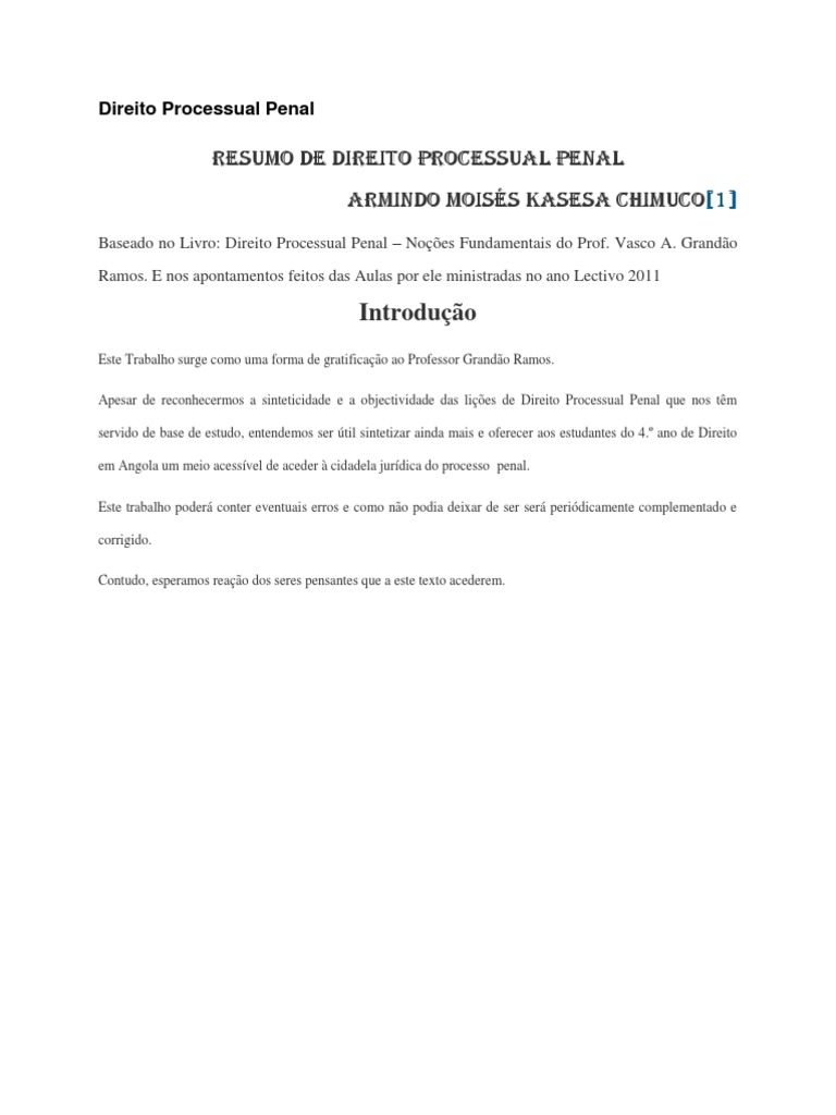 Este Trabalho surge como uma forma de gratificao ao Professor Grando Ramos. Apesar de reconhecermos a sinteticidade e a objectividade das lies de Direito Processual Penal que nos tm servido de base de estudo, entendemos ser til sintetizar ainda mais e oferecer aos estudantes do 4. ano de Direito em Angola um meio acessvel de aceder cidadela jurdica do processo penal. Este trabalho poder conter eventuais erros e como no podia deixar de ser ser peridicamente complementado e corrigido. Contudo, esperamos reao dos seres pensantes que a este texto acederem.