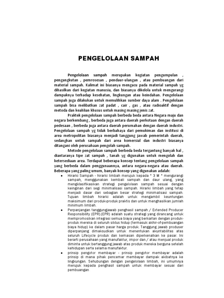 Hirarki Sampah - hirarki limbah merujuk kepada " 3 M " mengurangi sampah, menggunakan kembali sampah dan daur ulang, yang mengklasifikasikan strategi pengelolaan sampah sesuai dengan keinginan dari segi minimalisasi sampah. Hirarki limbah yang tetap menjadi dasar dari sebagian besar strategi minimalisasi sampah. Tujuan limbah hirarki adalah untuk mengambil keuntungan maksimum dari produk-produk praktis dan untuk menghasilkan jumlah minimum limbah. Perpanjangan tanggungjawab penghasil sampah / Extended Producer Responsibility (EPR).(EPR) adalah suatu strategi yang dirancang untuk mempromosikan integrasi semua biaya yang berkaitan dengan produkproduk mereka di seluruh siklus hidup (termasuk akhir-of-pembuangan biaya hidup) ke dalam pasar harga produk. Tanggung jawab produser diperpanjang dimaksudkan untuk menentukan akuntabilitas atas seluruh Lifecycle produk dan kemasan diperkenalkan ke pasar. Ini berarti perusahaan yang manufaktur, impor dan / atau menjual produk diminta untuk bertanggung jawab atas produk mereka berguna setelah kehidupan serta selama manufaktur. prinsip pengotor membayar - prinsip pengotor membayar adalah prinsip di mana pihak pencemar membayar dampak akibatnya ke lingkungan. Sehubungan dengan pengelolaan limbah, ini umumnya merujuk kepada penghasil sampah untuk membayar sesuai dari pembuangan