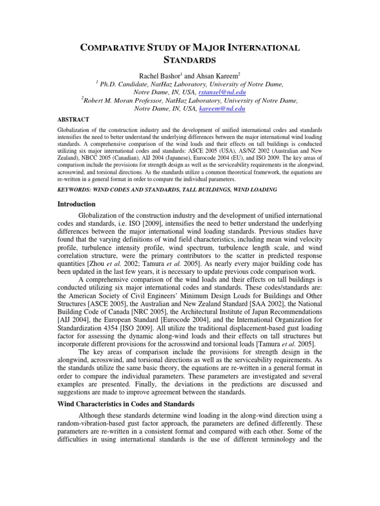 the American Society of Civil Engineers’ Minimum Design Loads for Buildings and Other Structures [ASCE 2005], the Australian and New Zealand Standard [SAA 2002], the National Building Code of Canada [NRC 2005], the Architectural Institute of Japan Recommendations [AIJ 2004], the European Standard [Eurocode 2004], and the International Organization for Standardization 4354 [ISO 2009]. All utilize the traditional displacement-based gust loading factor for assessing the dynamic along-wind loads and their effects on tall structures but incorporate different provisions for the acrosswind and torsional loads [Tamura et al. 2005]. The key areas of comparison include the provisions for strength design in the alongwind, acrosswind, and torsional directions as well as the serviceability requirements. As the standards utilize the same basic theory, the equations are re-written in a general format in order to compare the individual parameters. These parameters are investigated and several examples are presented. Finally, the deviations in the predictions are discussed and suggestions are made to improve agreement between the standards.