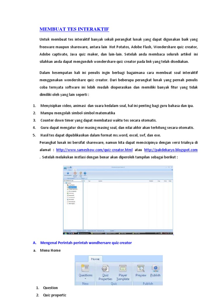 Untuk membuat tes interaktif banyak sekali perangkat lunak yang dapat digunakan baik yang freeware maupun shareware, antara lain Hot Potatos, Adobe Flash, Wondershare quiz creator, Adobe captivate, Java quiz maker, dan lain-lain. Setelah anda membaca seluruh artikel ini silahkan anda dapat mengunduh wondershare quiz creator pada link yang telah disediakan. Dalam kesempatan kali ini penulis ingin berbagi bagaimana cara membuat soal interaktif menggunakan wondershare quiz creator. Dari beberapa perangkat lunak yang pernah penulis coba ternyata software ini lebih mudah dioperasikan dan memiliki banyak fitur yang tidak dimiliki oleh yang lain seperti : 1. 2. 3. 4. 5. Menyisipkan video, animasi dan suara kedalam soal, hal ini penting bagi guru bahasa dan ipa. Mampu mengolah simbol-simbol matematika Counter down timer yang dapat membatasi waktu tes secara otomatis. Guru dapat mengatur skor masing masing soal, dan nilai akhir akan terhitung secara otomatis. Hasil tes dapat dipublikasikan dalam format ms.word, excel, swf, dan exe. Perangkat lunak ini bersifat shareware, namun kita dapat mencicipinya dengan versi trialnya di alamat : http://www.sameshow.com/quiz-creator.html atau http://pakdekaryo.blogspot.com . Setelah melakukan instlasi dengan benar akan diperoleh tampilan sebagai berikut :
