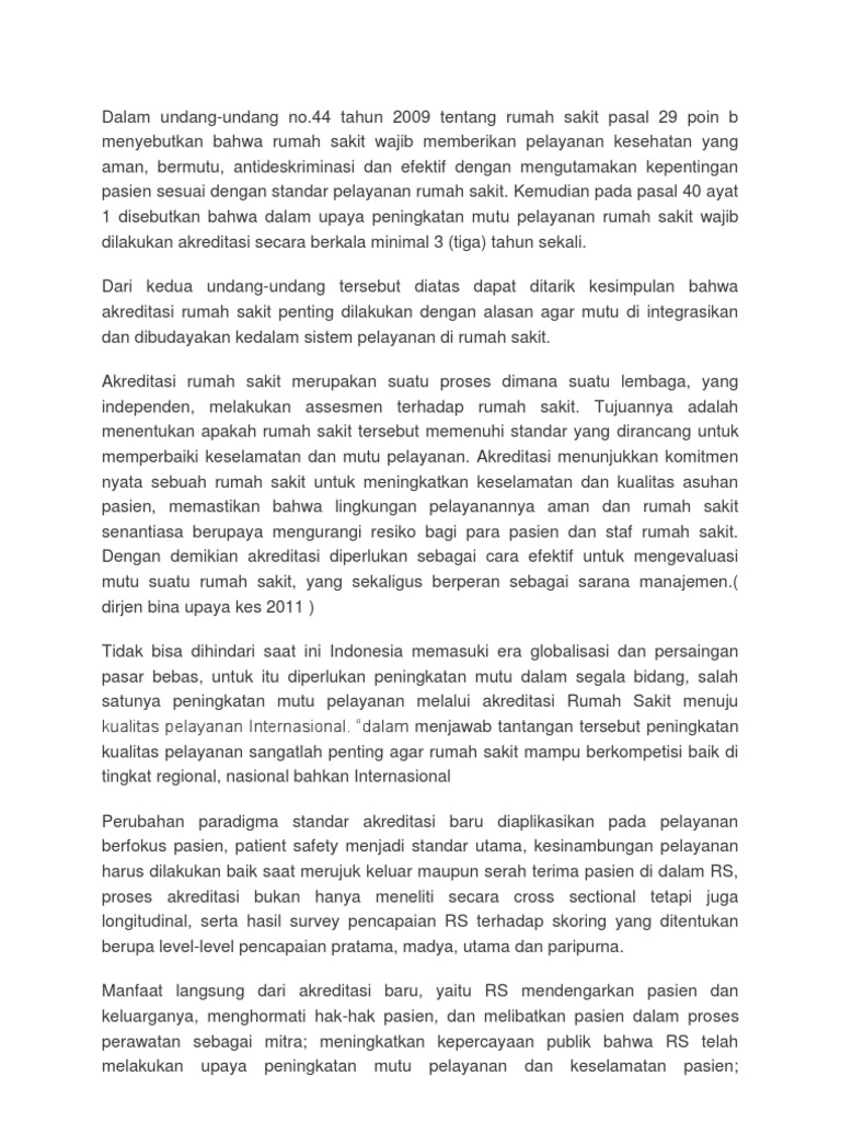 44 tahun 2009 tentang rumah sakit pasal 29 poin b menyebutkan bahwa rumah sakit wajib memberikan pelayanan kesehatan yang aman, bermutu, antideskriminasi dan efektif dengan mengutamakan kepentingan pasien sesuai dengan standar pelayanan rumah sakit. Kemudian pada pasal 40 ayat 1 disebutkan bahwa dalam upaya peningkatan mutu pelayanan rumah sakit wajib dilakukan akreditasi secara berkala minimal 3 (tiga) tahun sekali. Dari kedua undang-undang tersebut diatas dapat ditarik kesimpulan bahwa akreditasi rumah sakit penting dilakukan dengan alasan agar mutu di integrasikan dan dibudayakan kedalam sistem pelayanan di rumah sakit. Akreditasi rumah sakit merupakan suatu proses dimana suatu lembaga, yang independen, melakukan assesmen terhadap rumah sakit. Tujuannya adalah menentukan apakah rumah sakit tersebut memenuhi standar yang dirancang untuk memperbaiki keselamatan dan mutu pelayanan. Akreditasi menunjukkan komitmen nyata sebuah rumah sakit untuk meningkatkan keselamatan dan kualitas asuhan pasien, memastikan bahwa lingkungan pelayanannya aman dan rumah sakit senantiasa berupaya mengurangi resiko bagi para pasien dan staf rumah sakit. Dengan demikian akreditasi diperlukan sebagai cara efektif untuk mengevaluasi mutu suatu rumah sakit, yang sekaligus berperan sebagai sarana manajemen.( dirjen bina upaya kes 2011 ) Tidak bisa dihindari saat ini Indonesia memasuki era globalisasi dan persaingan pasar bebas, untuk itu diperlukan peningkatan mutu dalam segala bidang, salah satunya peningkatan mutu pelayanan melalui akreditasi Rumah Sakit menuju kualitas pelayanan Internasional. dalam menjawab tantangan tersebut peningkatan kualitas pelayanan sangatlah penting agar rumah sakit mampu berkompetisi baik di tingkat regional, nasional bahkan Internasional Perubahan paradigma standar akreditasi baru diaplikasikan pada pelayanan berfokus pasien, patient safety menjadi standar utama, kesinambungan pelayanan harus dilakukan baik saat merujuk keluar maupun serah terima pasien di dalam RS, proses akreditasi bukan hanya meneliti secara cross sectional tetapi juga longitudinal, serta hasil survey pencapaian RS terhadap skoring yang ditentukan berupa level-level pencapaian pratama, madya, utama dan paripurna. Manfaat langsung dari akreditasi baru, yaitu RS mendengarkan pasien dan keluarganya, menghormati hak-hak pasien, dan melibatkan pasien dalam proses perawatan sebagai mitra; meningkatkan kepercayaan publik bahwa RS telah melakukan upaya peningkatan mutu pelayanan dan keselamatan pasien;