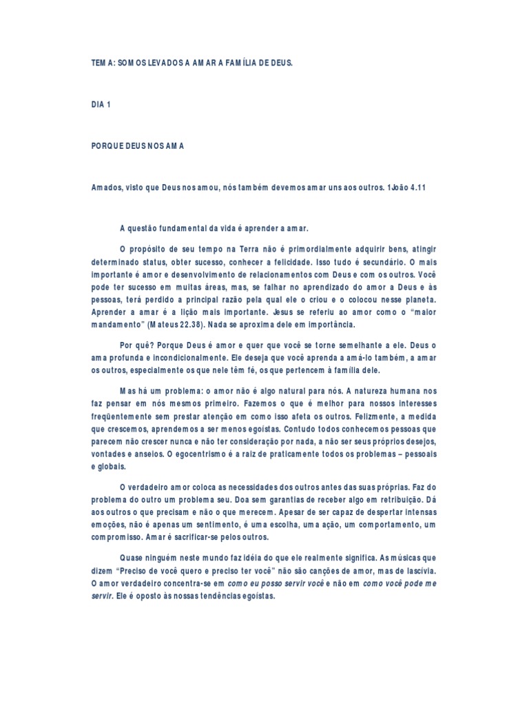 A questo fundamental da vida aprender a amar. O propsito de seu tempo na Terra no primordialmente adquirir bens, atingir determinado status, obter sucesso, conhecer a felicidade. Isso tudo secundrio. O mais importante amor e desenvolvimento de relacionamentos com Deus e com os outros. Voc pode ter sucesso em muitas reas, mas, se falhar no aprendizado do amor a Deus e s pessoas, ter perdido a principal razo pela qual ele o criou e o colocou nesse planeta. Aprender a amar a lio mais importante. Jesus se referiu ao amor como o maior mandamento (Mateus 22.38). Nada se aproxima dele em importncia. Por qu? Porque Deus amor e quer que voc se torne semelhante a ele. Deus o ama profunda e incondicionalmente. Ele deseja que voc aprenda a am-lo tambm, a amar os outros, especialmente os que nele tm f, os que pertencem famlia dele. Mas h um problema: o amor no algo natural para ns. A natureza humana nos faz pensar em ns mesmos primeiro. Fazemos o que melhor para nossos interesses freqentemente sem prestar ateno em como isso afeta os outros. Felizmente, a medida que crescemos, aprendemos a ser menos egostas. Contudo todos conhecemos pessoas que parecem no crescer nunca e no ter considerao por nada, a no ser seus prprios desejos, vontades e anseios. O egocentrismo a raiz de praticamente todos os problemas pessoais e globais. O verdadeiro amor coloca as necessidades dos outros antes das suas prprias. Faz do problema do outro um problema seu. Doa sem garantias de receber algo em retribuio. D aos outros o que precisam e no o que merecem. Apesar de ser capaz de despertar intensas emoes, no apenas um sentimento, uma escolha, uma ao, um comportamento, um compromisso. Amar sacrificar-se pelos outros. Quase ningum neste mundo faz idia do que ele realmente significa. As msicas que dizem Preciso de voc quero e preciso ter voc no so canes de amor, mas de lascvia. O amor verdadeiro concentra-se em como eu posso servir voc e no em como voc pode me servir. Ele oposto s nossas tendncias egostas.