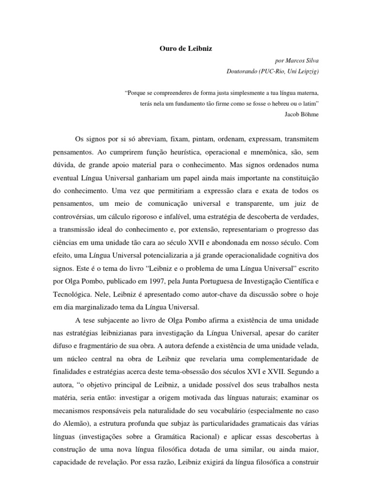Os vestgios desta comunidade sinttica poderiam justificar a tentativa de prospeco do ouro auxiliada, por exemplo, pela nossa avanada mecnica de projees algbricas, homomorfismos, mapeamentos e modelos. O que fica aps a leitura do livro de Olga Pombo a sensao de que um projeto de Lngua Universal, caso coordenado pelas inspiraes seminais de Leibniz, alm de ainda ser desejvel, poderia tambm ser vivel pelo atual grau de avanos tcnicos em Lingstica e Lgica. Mas deveramos primeiro acreditar no ouro, antes de busc-lo. Ouro de Leibniz, no de tolo.