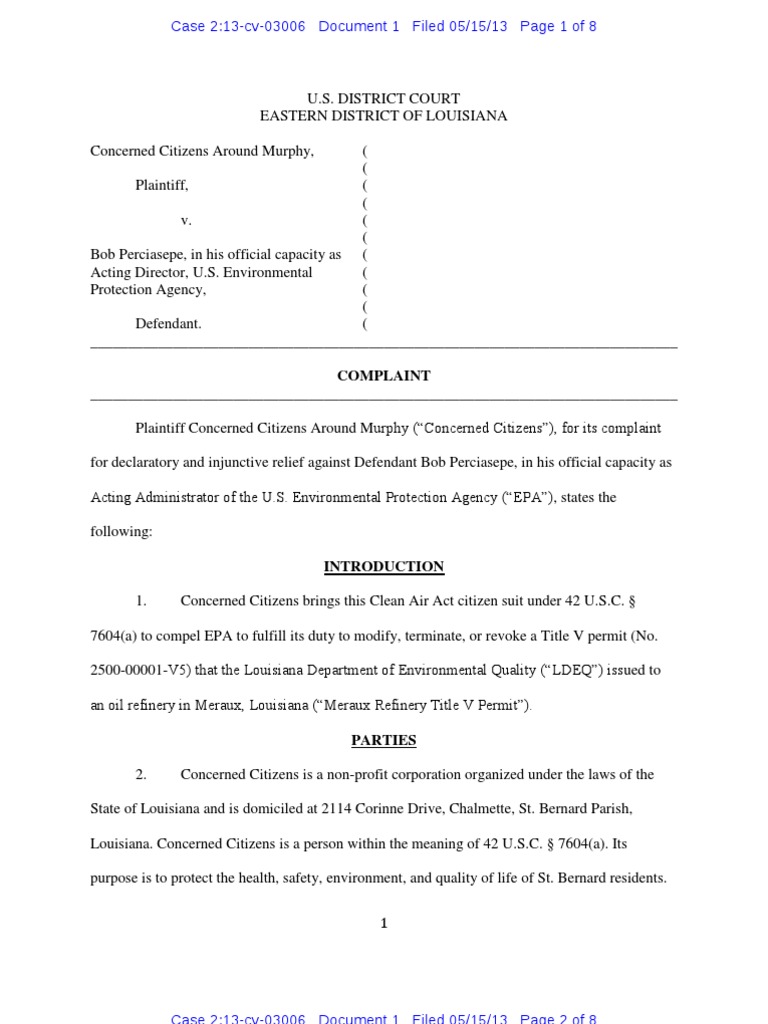 U.S. DISTRICT COURT EASTERN DISTRICT OF LOUISIANA Concerned Citizens Around Murphy, ( ( Plaintiff, ( ( v. ( ( Bob Perciasepe, in his official capacity as ( Acting Director, U.S. Environmental ( Protection Agency, ( ( Defendant. ( ______________________________________________________________________________ COMPLAINT ______________________________________________________________________________ Plaintiff Concerned Citizens Around Murphy (Concerned Citizens), for its complaint for declaratory and injunctive relief against Defendant Bob Perciasepe, in his official capacity as Acting Administrator of the U.S. Environmental Protection Agency (EPA), states the following: INTRODUCTION 1. Concerned Citizens brings this Clean Air Act citizen suit under 42 U.S.C.