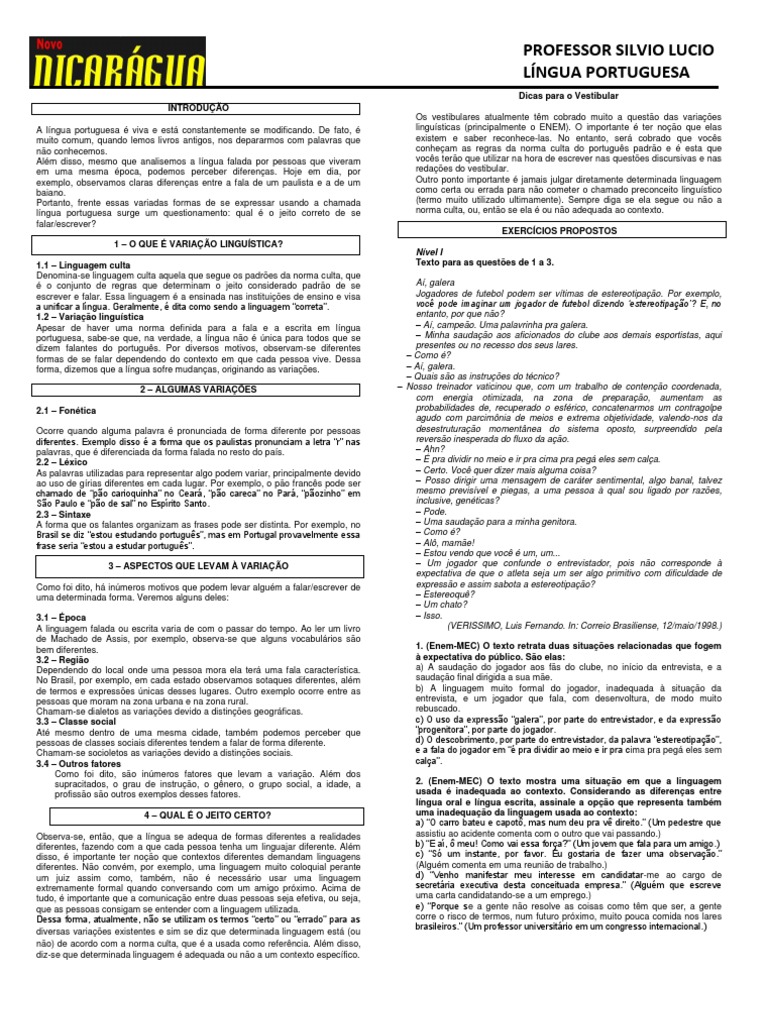 Dicas para o Vestibular INTRODUO A lngua portuguesa viva e est constantemente se modificando. De fato, muito comum, quando lemos livros antigos, nos depararmos com palavras que no conhecemos. Alm disso, mesmo que analisemos a lngua falada por pessoas que viveram em uma mesma poca, podemos perceber diferenas. Hoje em dia, por exemplo, observamos claras diferenas entre a fala de um paulista e a de um baiano. Portanto, frente essas variadas formas de se expressar usando a chamada lngua portuguesa surge um questionamento: qual o jeito correto de se falar/escrever? 1 O QUE VARIAO LINGUSTICA? 1.1 Linguagem culta Denomina-se linguagem culta aquela que segue os padres da norma culta, que o conjunto de regras que determinam o jeito considerado padro de se escrever e falar. Essa linguagem a ensinada nas instituies de ensino e visa a unificar a lngua. Geralmente, dita como sendo a linguagem correta. 1.2 Variao lingustica Apesar de haver uma norma definida para a fala e a escrita em lngua portuguesa, sabe-se que, na verdade, a lngua no nica para todos que se dizem falantes do portugus. Por diversos motivos, observam-se diferentes formas de se falar dependendo do contexto em que cada pessoa vive. Dessa forma, dizemos que a lngua sofre mudanas, originando as variaes. 2 ALGUMAS VARIAES 2.1 Fontica Ocorre quando alguma palavra pronunciada de forma diferente por pessoas diferentes. Exemplo disso a forma que os paulistas pronunciam a letra r nas palavras, que diferenciada da forma falada no resto do pas. 2.2 Lxico As palavras utilizadas para representar algo podem variar, principalmente devido ao uso de grias diferentes em cada lugar. Por exemplo, o po francs pode ser chamado de po carioquinha no Cear, po careca no Par, pozinho em So Paulo e po de sal no Esprito Santo. 2.3 Sintaxe A forma que os falantes organizam as frases pode ser distinta. Por exemplo, no Brasil se diz estou estudando portugus, mas em Portugal provavelmente essa frase seria estou a estudar portugus. 3 ASPECTOS QUE LEVAM VARIAO Como foi dito, h inmeros motivos que podem levar algum a falar/escrever de uma determinada forma. Veremos alguns deles: 3.1 poca A linguagem falada ou escrita varia de com o passar do tempo. Ao ler um livro de Machado de Assis, por exemplo, observa-se que alguns vocabulrios so bem diferentes. 3.2 Regio Dependendo do local onde uma pessoa mora ela ter uma fala caracterstica. No Brasil, por exemplo, em cada estado observamos sotaques diferentes, alm de termos e expresses nicas desses lugares. Outro exemplo ocorre entre as pessoas que moram na zona urbana e na zona rural. Chamam-se dialetos as variaes devido a distines geogrficas. 3.3 Classe social At mesmo dentro de uma mesma cidade, tambm podemos perceber que pessoas de classes sociais diferentes tendem a falar de forma diferente. Chamam-se socioletos as variaes devido a distines sociais. 3.4 Outros fatores Como foi dito, so inmeros fatores que levam a variao. Alm dos supracitados, o grau de instruo, o gnero, o grupo social, a idade, a profisso so outros exemplos desses fatores. 4 QUAL O JEITO CERTO? Observa-se, ento, que a lngua se adequa de formas diferentes a realidades diferentes, fazendo com a que cada pessoa tenha um linguajar diferente. Alm disso, importante ter noo que contextos diferentes demandam linguagens diferentes. No convm, por exemplo, uma linguagem muito coloquial perante um juiz assim como, tambm, no necessrio usar uma linguagem extremamente formal quando conversando com um amigo prximo. Acima de tudo, importante que a comunicao entre duas pessoas seja efetiva, ou seja, que as pessoas consigam se entender com a linguagem utilizada. Dessa forma, atualmente, no se utilizam os termos certo ou errado para as diversas variaes existentes e sim se diz que determinada linguagem est (ou no) de acordo com a norma culta, que a usada como referncia. Alm disso, diz-se que determinada linguagem adequada ou no a um contexto especfico. Os vestibulares atualmente tm cobrado muito a questo das variaes lingusticas (principalmente o ENEM). O importante ter noo que elas existem e saber reconhece-las. No entanto, ser cobrado que vocs conheam as regras da norma culta do portugus padro e esta que vocs tero que utilizar na hora de escrever nas questes discursivas e nas redaes do vestibular. Outro ponto importante jamais julgar diretamente determinada linguagem como certa ou errada para no cometer o chamado preconceito lingustico (termo muito utilizado ultimamente). Sempre diga se ela segue ou no a norma culta, ou, ento se ela ou no adequada ao contexto. EXERCCIOS PROPOSTOS Nvel I Texto para as questes de 1 a 3. A, galera Jogadores de futebol podem ser vtimas de estereotipao. Por exemplo, voc pode imaginar um jogador de futebol dizendo estereotipao? E, no entanto, por que no? A, campeo. Uma palavrinha pra galera. Minha saudao aos aficionados do clube aos demais esportistas, aqui presentes ou no recesso dos seus lares. Como ? A, galera. Quais so as instrues do tcnico? Nosso treinador vaticinou que, com um trabalho de conteno coordenada, com energia otimizada, na zona de preparao, aumentam as probabilidades de, recuperado o esfrico, concatenarmos um contragolpe agudo com parcimnia de meios e extrema objetividade, valendo-nos da desestruturao momentnea do sistema oposto, surpreendido pela reverso inesperada do fluxo da ao. Ahn? pra dividir no meio e ir pra cima pra peg eles sem cala. Certo. Voc quer dizer mais alguma coisa? Posso dirigir uma mensagem de carter sentimental, algo banal, talvez mesmo previsvel e piegas, a uma pessoa qual sou ligado por razes, inclusive, genticas? Pode. Uma saudao para a minha genitora. Como ? Al, mame! Estou vendo que voc um, um... Um jogador que confunde o entrevistador, pois no corresponde expectativa de que o atleta seja um ser algo primitivo com dificuldade de expresso e assim sabota a estereotipao? Estereoqu? Um chato? Isso. (VERISSIMO, Luis Fernando. In: Correio Brasiliense, 12/maio/1998.) 1. (Enem-MEC) O texto retrata duas situaes relaci