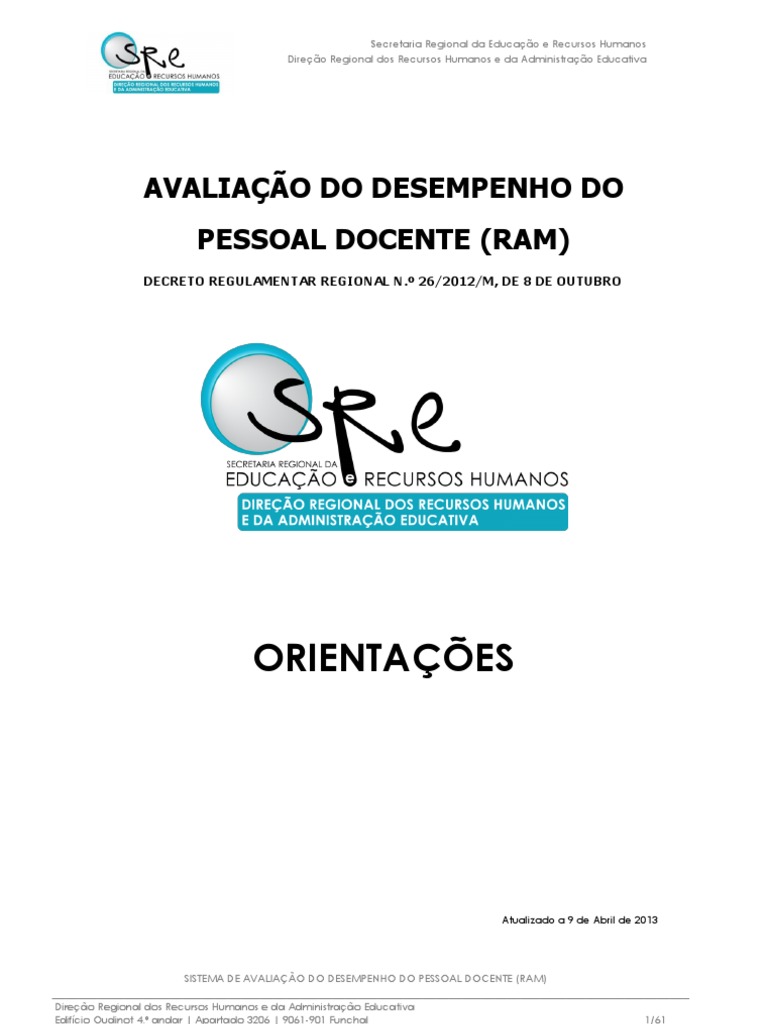 O presente documento visa emanar orientações sobre a aplicação do disposto no sistema de avaliação do desempenho do pessoal docente, aprovado pelo Decreto Regulamentar Regional n.º 26/2012/M, de 8 de outubro, articulando-o com o estatuído no Estatuto da Carreira Docente da Região Autónoma da Madeira, aprovado pelo Decreto Legislativo Regional n.º 6/2008/M, de 25 de fevereiro, alterado pelos Decretos Legislativos Regionais n. os 17/2010/M, de 18 de agosto, e 20/2012/M, de 29 de agosto, adiante designado apenas por ECD da RAM.