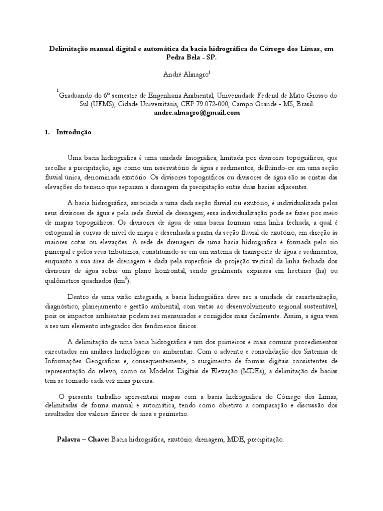 1. Introduo Uma bacia hidrogrfica uma unidade fisiogrfica, limitada por divisores topogrficos, que recolhe a precipitao, age como um reservatrio de gua e sedimentos, defluindo-os em uma seo fluvial nica, denominada exutrio. Os divisores topogrficos ou divisores de gua so as cristas das elevaes do terreno que separam a drenagem da precipitao entre duas bacias adjacentes. A bacia hidrogrfica, associada a uma dada seo fluvial ou exutrio, individualizada pelos seus divisores de gua e pela rede fluvial de drenagem; essa individualizao pode se fazer por meio de mapas topogrficos. Os divisores de gua de uma bacia formam uma linha fechada, a qual ortogonal s curvas de nvel do mapa e desenhada a partir da seo fluvial do exutrio, em direo s maiores cotas ou elevaes. A rede de drenagem de uma bacia hidrogrfica formada pelo rio principal e pelos seus tributrios, constituindo-se em um sistema de transporte de gua e sedimentos, enquanto a sua rea de drenagem dada pela superfcie da projeo vertical da linha fechada dos divisores de gua sobre um plano horizontal, sendo geralmente expressa em hectares (ha) ou quilmetros quadrados (km2). Dentro de uma viso integrada, a bacia hidrogrfica deve ser a unidade de caracterizao, diagnstico, planejamento e gesto ambiental, com vistas ao desenvolvimento regional sustentvel, pois os impactos ambientais podem ser mensurados e corrigidos mais facilmente. Assim, a gua vem a ser um elemento integrador dos fenmenos fsicos. A delimitao de uma bacia hidrogrfica um dos primeiros e mais comuns procedimentos executados em anlises hidrolgicas ou ambientais. Com o advento e consolidao dos Sistemas de Informaes Geogrficas e, consequentemente, o surgimento de formas digitais consistentes de representao do relevo, como os Modelos Digitais de Elevao (MDEs), a delimitao de bacias tem se tornado cada vez mais precisa. O presente trabalho apresentar mapas com a bacia hidrogrfica do Crrego dos Limas, delimitadas de forma manual e automtica, tendo como objetivo a comparao e discusso dos resultados dos valores fsicos de rea e permetro. Palavra Chave: Bacia hidrogrfica, exutrio, drenagem, MDE, precipitao.