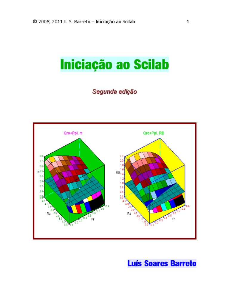 Prefcio Primeira Edio Inserir exerccios de forma informal, ao longo do texto, para estimular a leitora a controlar o seu progresso na aprendizagem do Scilab. Quando iniciei este texto, pretendia que fosse particularmente dirigido a bilogos e ecologistas, mas como no conheo outro similar em lngua portuguesa e no existe traduo para portugus da ajuda do Scilab, procurei escrev-lo na perspetiva de poder ser til a qualquer pessoa interessada. No entanto, reconheo que impossvel expurgar completamente a influncia do domnio da minha especializao, no produto final que disponibilizo aqui. O livro, para alm da Sinopse Geral, estende-se por oito captulos. O primeiro tem por finalidade proporcionar, de uma maneira simples e suave, uma iniciao ao uso do Scilab. O captulo dois pretende ser uma transio para aplicaes mais avanadas. Os conhecimentos de Scilab aqui introduzidos so-no atravs de exerccios simples de aritmtica, matemtica e fsica elementares, recorrendo a conhecimentos que adquiriu nos ensinos bsico e secundrio. A criao, manipulao e anlise de vetores e matrizes preenchem o captulo terceiro. No quarto captulo inicio o leitor na utilizao dos vastos recursos do Scilab para criar grficos, tirando o mximo benefcio da interface grfica das janelas dos grficos. No quinto captulo introduzo outros comandos do Scilab, tidos como entre os mais comummente utilizados. Para a leitora no familiarizada com a programao, exponho os conceitos bsicos sobre o tema, no sexto captulo. O captulo stimo ocupa-se da programao em Scilab e, finalmente, o oitavo apresenta vrios programas de aplicao. Ao longo do texto, uso a primeira pessoa tanto no plural como no singular. No inconsistncia. No primeiro caso por entender ser a leitura deste livro uma conversa a dois, uma aventura intelectual compartilhada, de certo modo um acto de companheirismo. No segundo, porque ocorrem situaes ao longo da caminhada, que tm de ser assumidas s pelo autor. Desejo-lhe uma agradvel e proveitosa leitura e .... mos obra. L. S. B. Costa de Caparica, maro de 2008