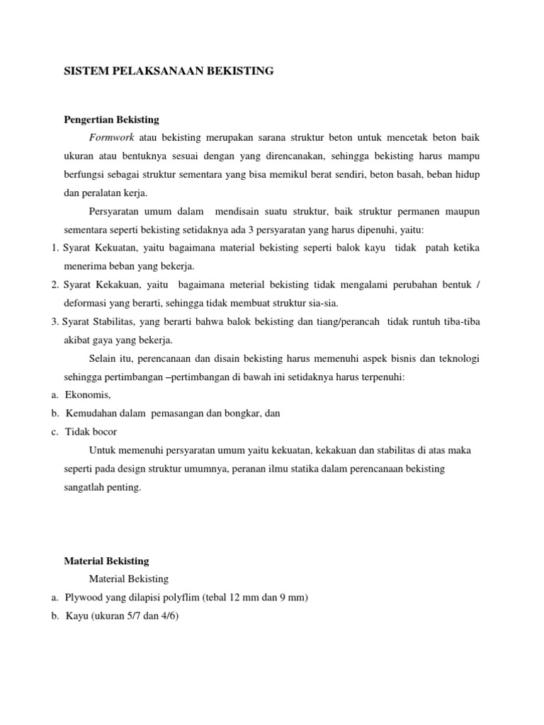 Pengertian Bekisting Formwork atau bekisting merupakan sarana struktur beton untuk mencetak beton baik ukuran atau bentuknya sesuai dengan yang direncanakan, sehingga bekisting harus mampu berfungsi sebagai struktur sementara yang bisa memikul berat sendiri, beton basah, beban hidup dan peralatan kerja. Persyaratan umum dalam mendisain suatu struktur, baik struktur permanen maupun