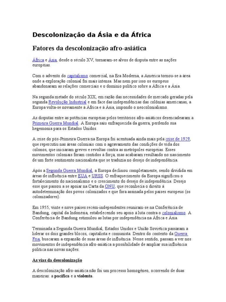 No caso da via pacfica, a independncia da colnia era realizada progressivamente pela metrpole, com a concesso da autonomia poltico-administrativa, mantendo-se o controle econmico do novo pas, criando, dessa forma, um novo tipo de dependncia. As independncias que ocorreram pela via da violncia resultaram da intransigncia das metrpoles em conceder a autonomia s colnias. Surgiam as lutas de emancipao, geralmente vinculadas ao socialismo, que levaram a cabo as independncias.