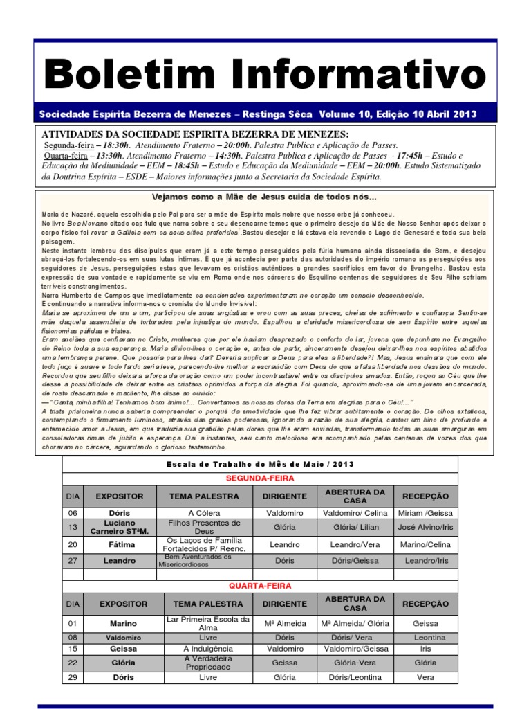 Sociedade Esprita Bezerra de Menezes Restinga Sca Volume 10, Edio 10 Abril 2013