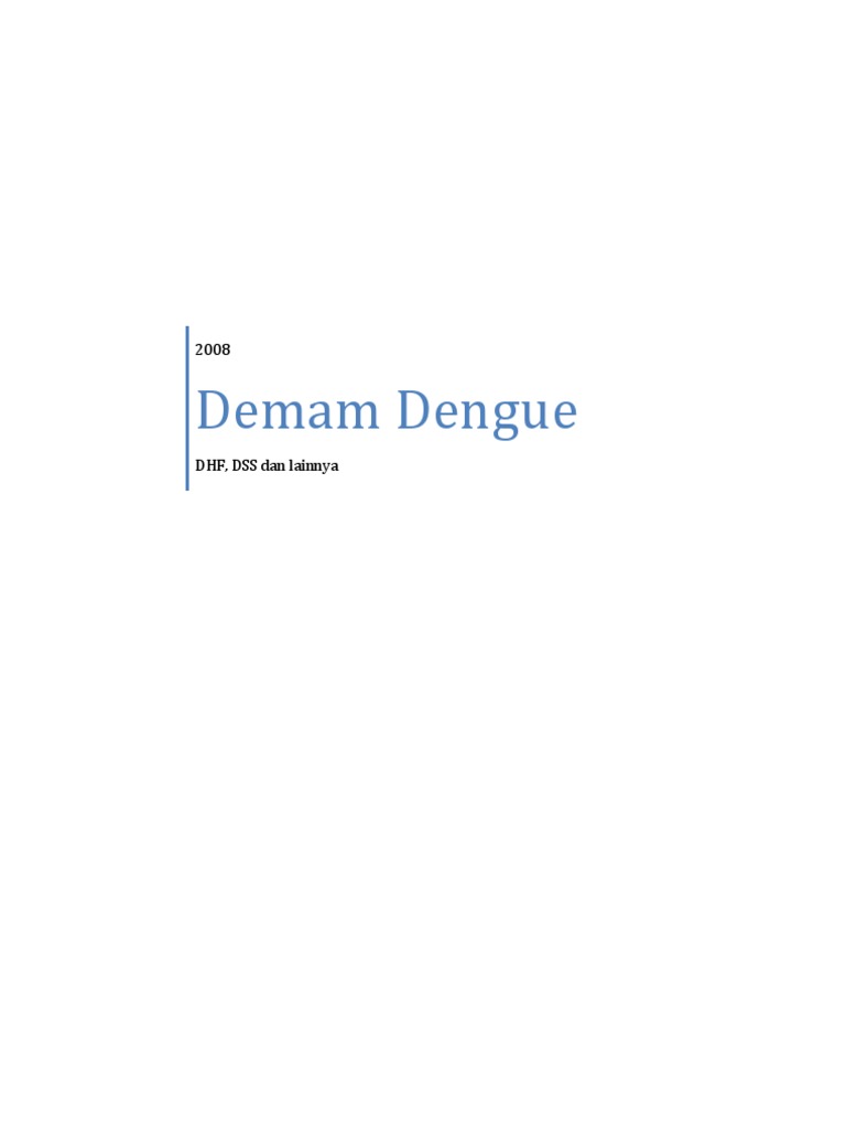 1. Definisi Demam dengue/DD dan Demam berdarah dengue/DBD (Dengue Haemorhagic Fever/DHF) adalah penyakit infeksi yang disebabkan oleh virus dengue dengan manifestasi klinis demam, nyeri otot, dan/atau nyeri sendi yang disertai oleh leukopenia ,ruam, limfadenopati,trombositopeni,dan diatesis hemoragic. Pada DBD terjadi perembesan plasma yang ditandai oleh hemokonsentrasi (peningkatan Hematokrit) atau penumpukan cairan dirongga tubuh. Sindrom Renjatan Dengue (Dengue Syok Sindrom) adalah demam berdarah dengue yang ditandai dengan renjatan/syok (WHO, 1997).