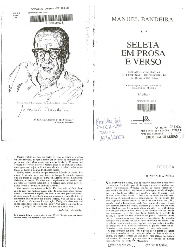 Procuro me lembrar de outras impresses poticas da primeira infncia e eis que me acodem os primeiros livros de imagens: Joo Felpudo, Simplicio Olha pro Ar, Viagem Roda do Mundo numa Casquinha de Noz. Sobretudo este ltimo teve inOuncia muito forte em mim; por ele adquiri a noo de haver uma realidade mais bela, derente da realidade quotidiana, e a pgina do macaco tirando cocos para os meninos despertou o meu primeiro desejo de evaso. No fundo, j era Pasrgada4 que se prenunciava.