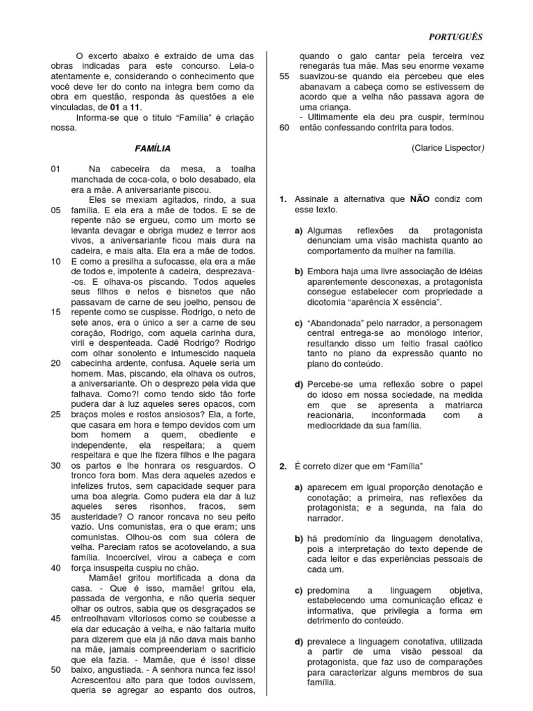 O excerto abaixo é extraído de uma das obras indicadas para este concurso. Leia-o atentamente e, considerando o conhecimento que você deve ter do conto na íntegra bem como da obra em questão, responda às questões a ele vinculadas, de 01 a 11. Informa-se que o título “Família” é criação |