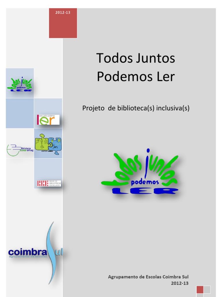 A Rede de Bibliotecas Escolares e a Direo de Servios da Educao Especial e Apoios Socioeducativos conceberam um projeto conjunto denominado Todos Juntos Podemos Ler, que tem como principal objetivo a criao de bibliotecas inclusivas, que assegurem reais oportunidades de leitura para todos os alunos. Este , talvez, um dos maiores desafios colocados s bibliotecas, que se devem assumir como espao de excelncia para o desenvolvimento da literacia e como garante da igualdade de oportunidades quer em contexto sociocultural quer em situao de aprendizagem. Tendo em conta as vrias atividades j implementadas em coordenao entre o Centro de Recursos TIC para a Educao Especial de Coimbra (CRTIC- Coimbra) e a Biblioteca Escolar (BE) do Agrupamento de Escolas Coimbra Sul (AECS), nomeadamente as decorrentes do projeto Leituras Inclusivas, integramos no projeto Todos Juntos Podemos Ler. Lanado pela Rede de Bibliotecas Escolar (RBE), visa dotar a Biblioteca Escolar (BE) de um fundo documental, em formatos acessveis a todos os alunos, que permita dinamizar atividades de leitura, nomeadamente ao nvel da elaborao de histrias e produo de livros em diferentes formatos (linguagem simblica, udio livros, lngua gestual portuguesa e braille). Pretende-se tambm constituir conjuntos documentais por assuntos, contribuindo, assim, para a diversificao de materiais a utilizar em diferentes contextos de aprendizagem. Este projeto integra-se no projeto aler+ e foi apresentado e aprovado em Conselho Pedaggico (janeiro de 2013).
