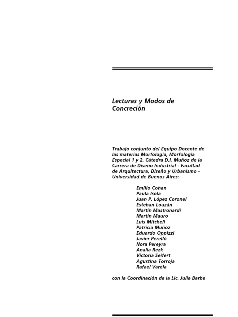 Trabajo conjunto del Equipo Docente de las materias Morfología, Morfología Especial 1 y 2, Cátedra D.I. Muñoz de la Carrera de Diseño Industrial - Facultad de Arquitectura, Diseño y Urbanismo Universidad de Buenos Aires: Emilio Cohan Paula Isola Juan P. López Coronel Esteban Louzán Martín Mastronardi Martín Mauro Luis Mitchell Patricia Muñoz Eduardo Oppizzi Javier Perelló Nora Pereyra Analía Rezk Victoria Seifert Agustina Torroja Rafael Varela con la Coordinación de la Lic. Julia Barbe