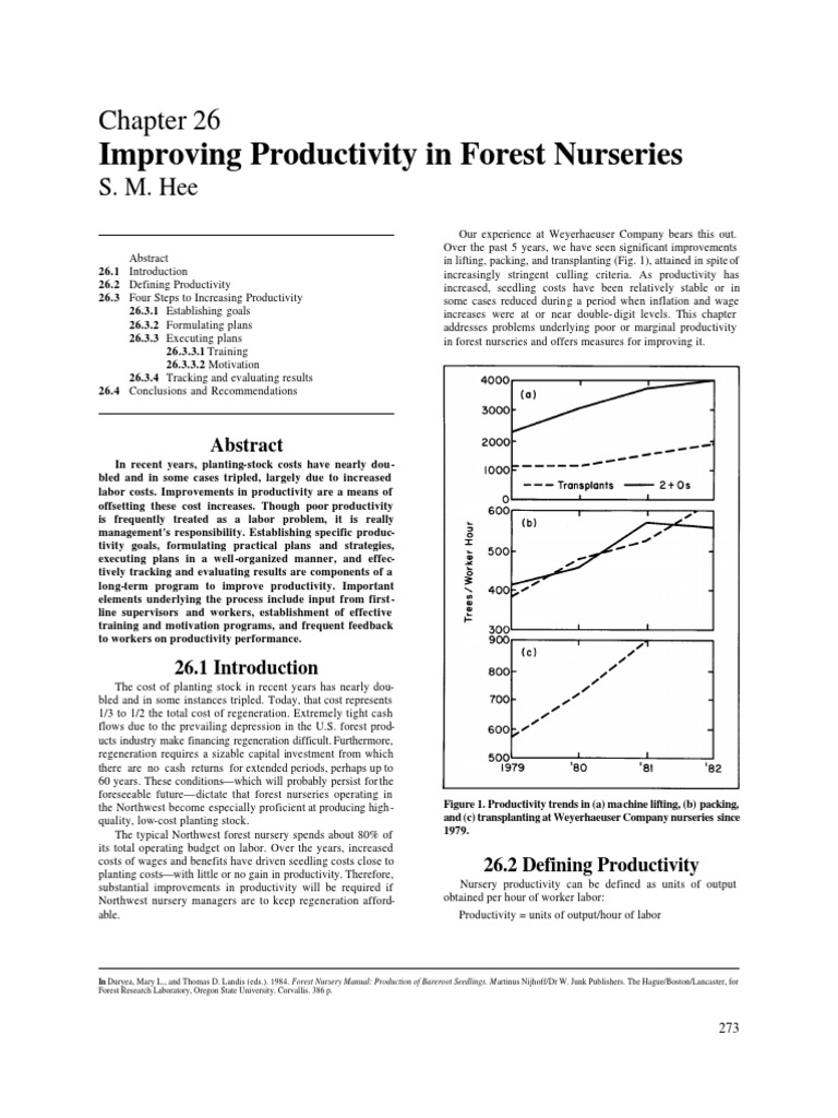 Abstract 26.1 Introduction 26.2 Defining Productivity 26.3 Four Steps to Increasing Productivity 26.3.1 Establishing goals 26.3.2 Formulating plans 26.3.3 Executing plans 26.3.3.1 Training 26.3.3.2 Motivation 26.3.4 Tracking and evaluating results 26.4 Conclusions and Recommendations Our experience at Weyerhaeuser Company bears this out. Over the past 5 years, we have seen significant improvements in lifting, packing, and transplanting (Fig. 1), attained in spite of increasingly stringent culling criteria. As productivity has increased, seedling costs have been relatively stable or in some cases reduced during a period when inflation and wage increases were at or near double- digit levels. This chapter addresses problems underlying poor or marginal productivity in forest nurseries and offers measures for improving it.